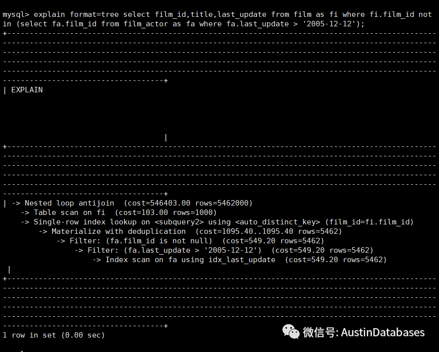 整体的执行计划变更中,虽然使用的 last_update 的索引,但并没有提高查询效率,同时因为是排除在查询中还添加 film_id is not null , 然后使用了MYSQL 8.021 后提供的 antijoin 的方式来进行两个表的反向的数据连接。