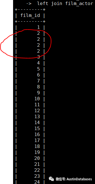 实际上在film_actor 中就存在 4条 film_id =2 的记录,所以LEFT JOIN 如实的包括了4 个2 的记录, 而 EXIST IN 则带有去重的功能,所以在结果中只有一个 2 的记录。