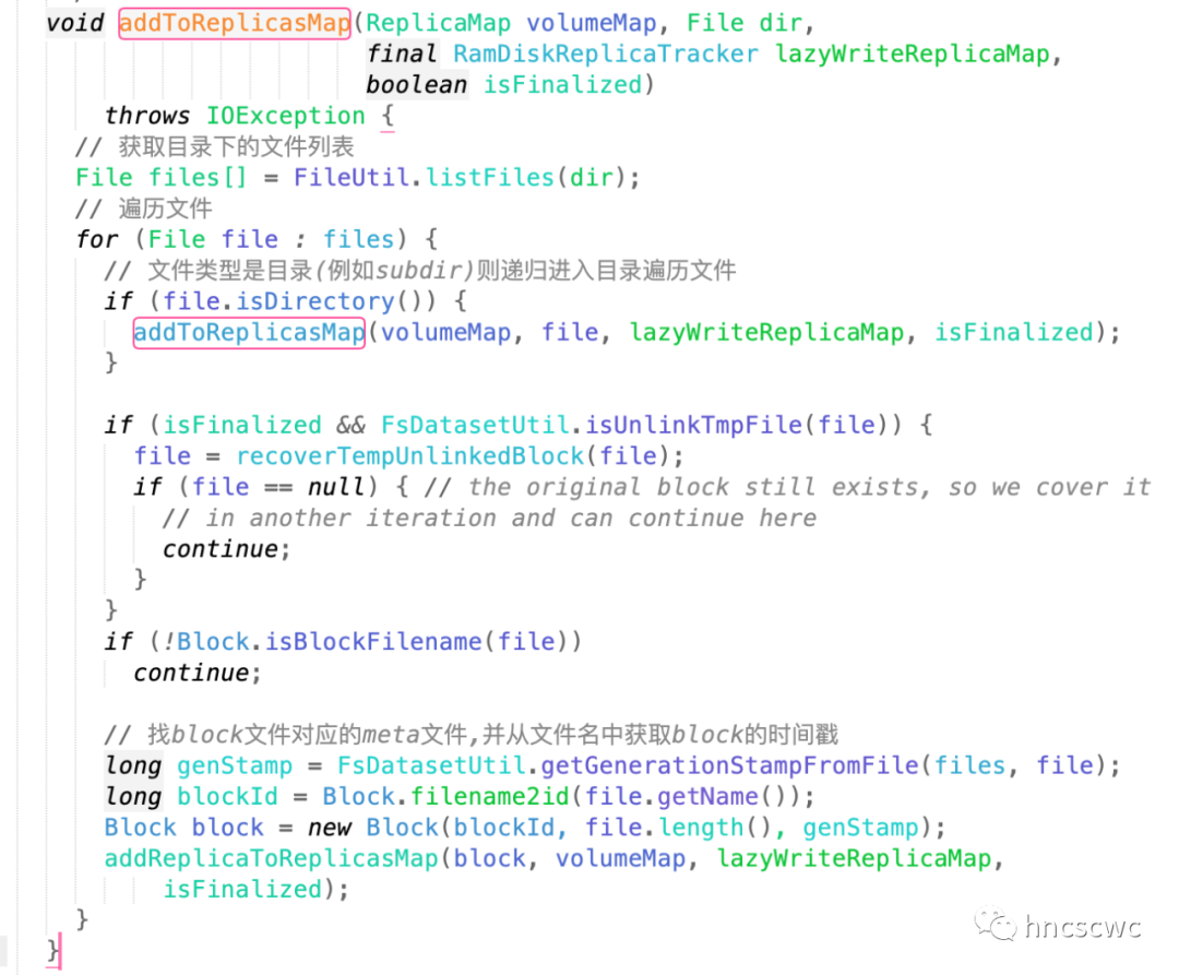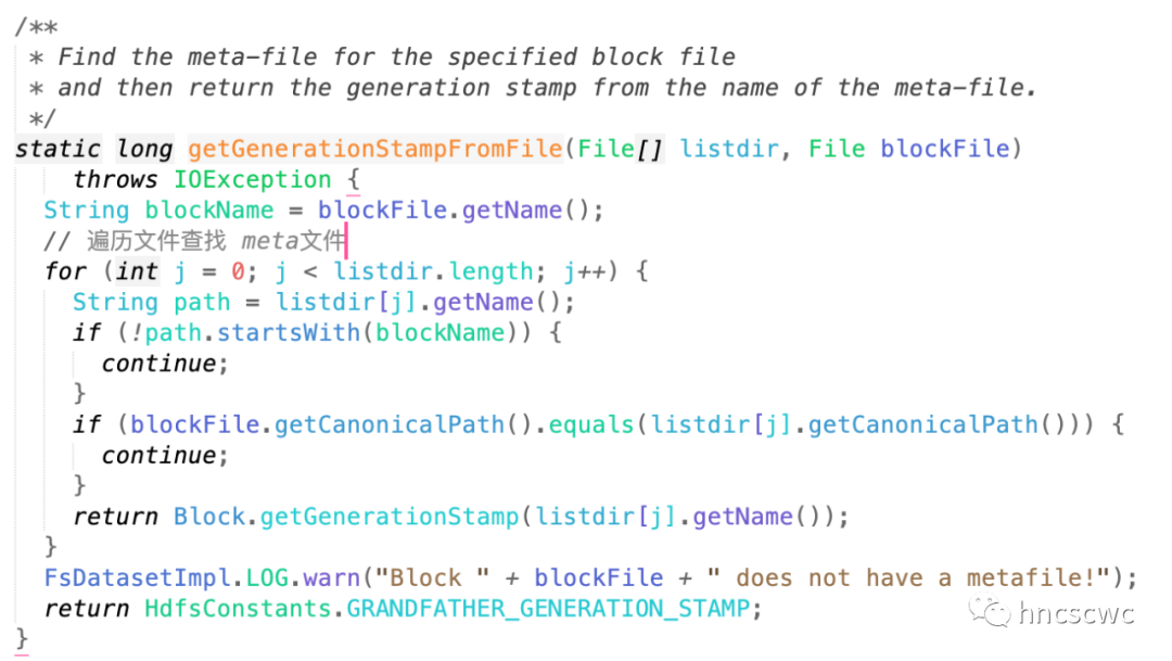 注:贴出的代码的版本为2.8.5,在新的版本中,这个逻辑已经进行了优化,list目录下的文件后先进行一次排序,由于block文件和对应meta文件具有相同的前缀,这样查找meta文件获取时间戳的耗时几乎就没有了(详细可以查看最新版本的代码)。