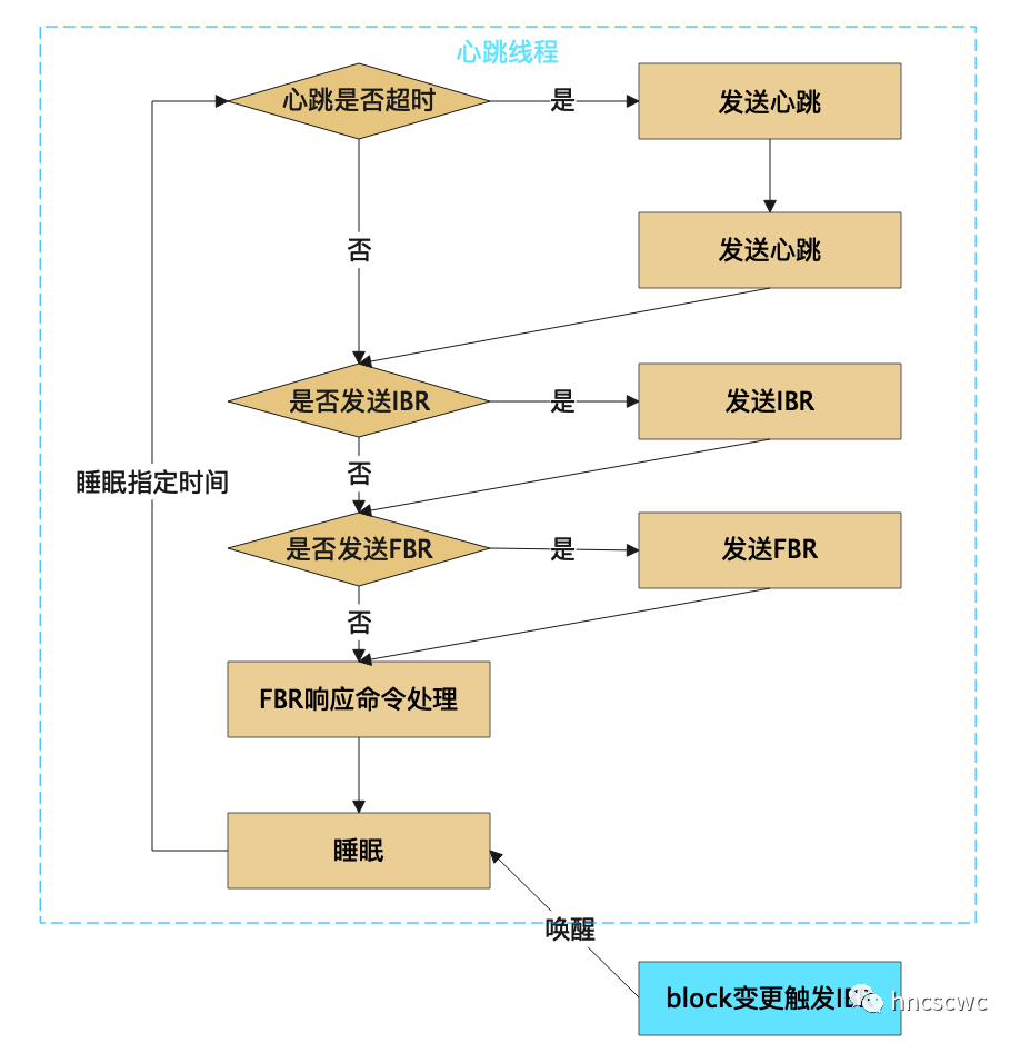在DN内部,块汇报(不管是全量还是增量)都是在心跳线程中发送的。心跳线程的处理逻辑,大概如下图所示: