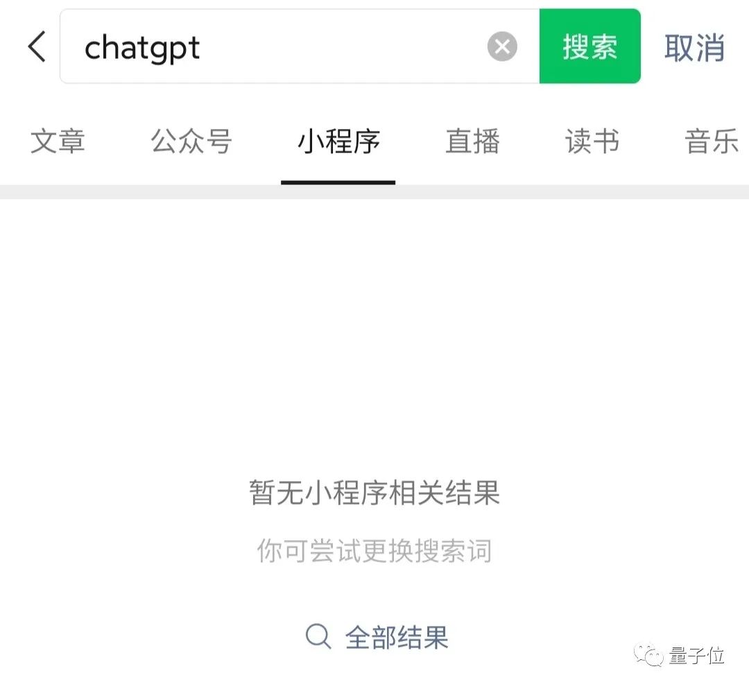 以“ChatGPT”为关键词在微信搜索,显示“暂无小程序相关结果”。