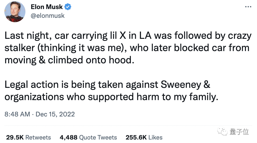 马斯克在最新一条推特中表示,载着自己儿子“X”的汽车在洛杉矶被人驾车跟踪,甚至汽车被逼停后此人还爬上了引擎盖。