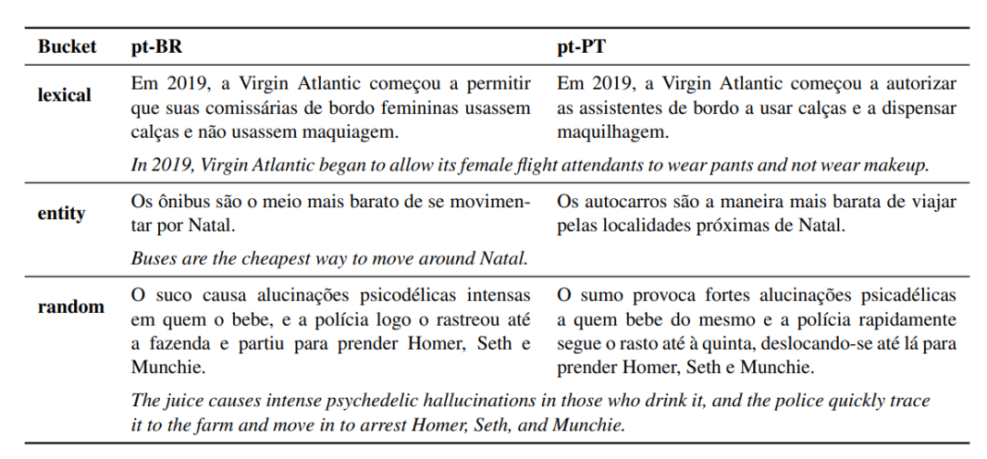 词汇桶主要关注不同地区在词汇选择上的差异,例如当把一个带有单词「bus」的句子分别翻译成巴西语和欧洲葡萄牙语时,模型需要能够识别出「ônibus」与「autocarro」的区别。