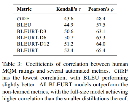根据 MQM 评估者对几个基线模型翻译结果的评分,可以发现 BLEURT 与人类判断具有最好的相关性,并且该相关性的强度(0.65 Pearson 相关系数,ρ)与标注者间一致性(0.70组内相关性)相当。