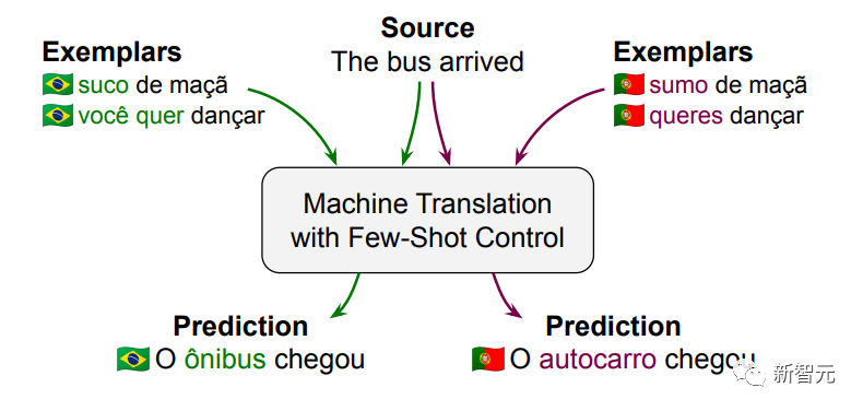 比如输入句子:The bus arrived,再给定几个巴西葡萄牙语的例子,模型应该能翻译出「O ônibus chegou」;如果给的样例是欧洲葡萄牙语,模型的翻译结果应该变为「O autocarro chegou」。