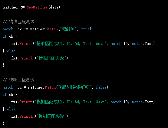 具体来说,匹配器首先将预设数据集中的每一条数据进行处理,将其中的中文逗号替换为英文逗号,然后将该数据切割成若干个单词,存储为一个字符串切片。对于输入文本,也会将其中的中文逗号替换为英文逗号,然后将其切割成若干个单词。然后,匹配器会遍历每一条数据,遍历其中的单词,计算每个单词在输入文本中出现的次数,将次数累加起来,作为该条数据与输入文本的匹配分值。在遍历过程中,可以通过参数 exactMatch 来指定匹配方式。最后,匹配器返回匹配分值最高的数据项,如果分值为 0 则表示未匹配成功。