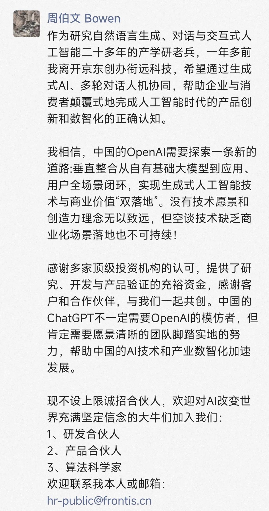 2月26日晚,周伯文发布一则AI英雄帖,招募合伙人一起打造中国版ChatGPT。