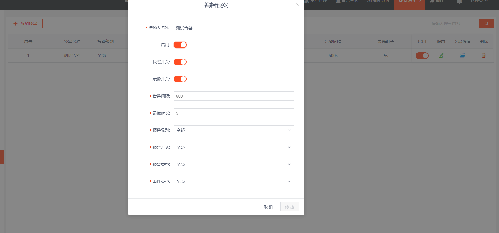 近期我们对EasyCVR平台的告警预案功能进行了优化。在此前的操作中我们发现,用户若关闭启用按钮,会一同关闭快照和录像。