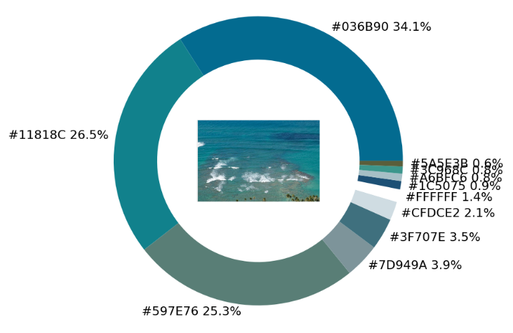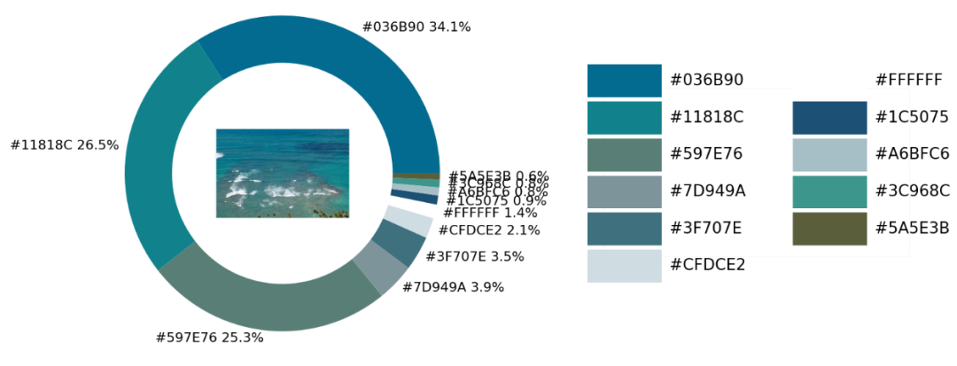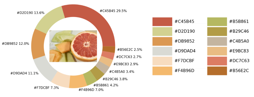 从出来的饼图中显示了每种不同颜色的占比,我们更进一步将原图放置在圆环当中,