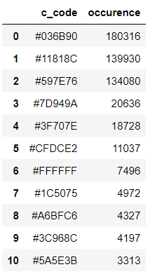 df = pd.DataFrame(zip(df_color_up, df_percent), columns=['c_code', 'occurence'])