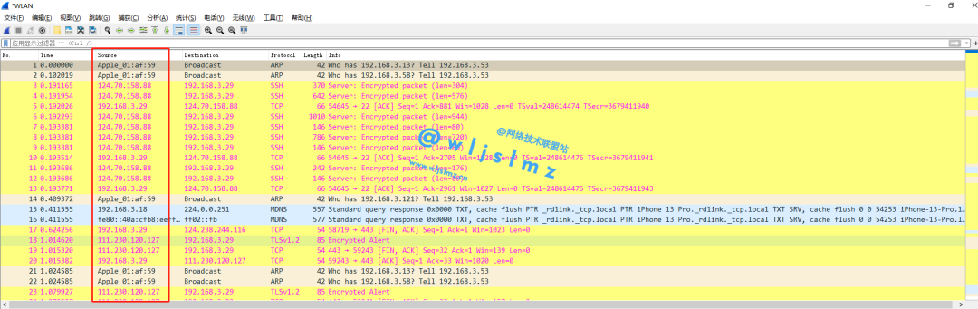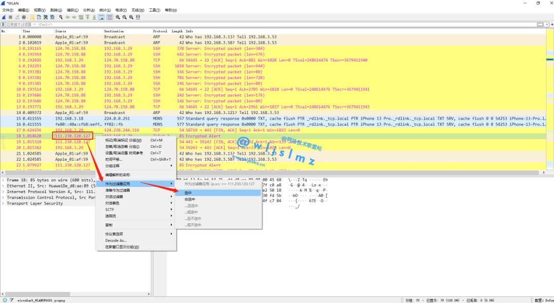 在source这一列有很多ip,这个时候你想过滤出源ip为111.230.120.127的包,只需要鼠标悬浮在source列任意一个111.230.120.127地址上,右击,选择“作为过滤器应用”,选择“选中”:
