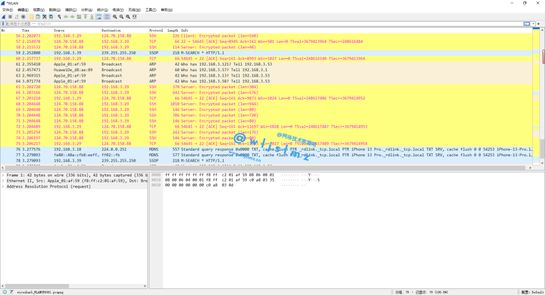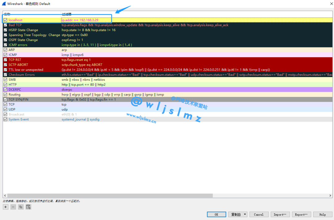 如上图,我增加了一个名为“localhost”着色规则,过滤器为“ip.addr == 192.168.3.29”,这是我本地的私网ip地址,也就是说当包涉及到我本地地址的时候就会着色显示,我们来试一下: