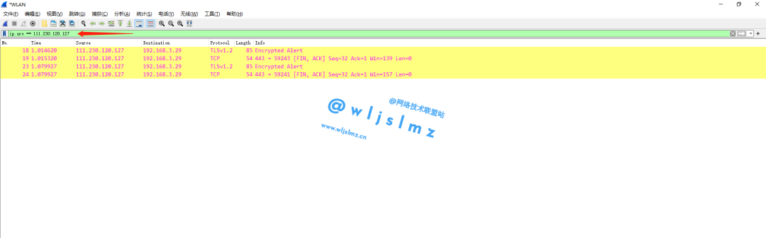 然后你会看到过滤器编辑框中自动加上了ip.src == 111.230.120.127,并且过滤出所有以111.230.120.127为源ip的包: