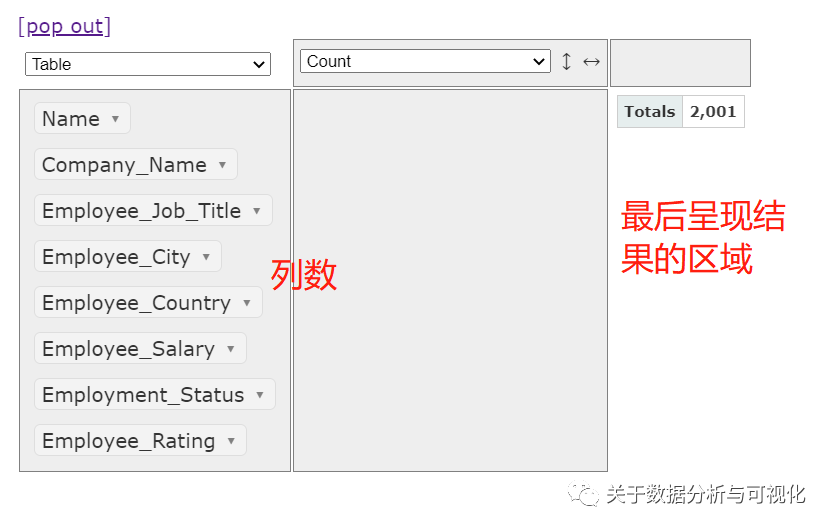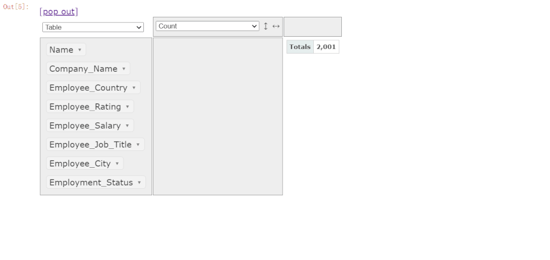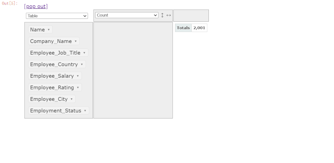 对于透视表而言,pivottablejs模块实现起来也格外的简单,我们只需要在上述操作的基础之上,将列拖拽到右边空白的长方形区域当中,例如我们想要看一下分布在不同城市当中不同职位员工的分布,就可以这么来做