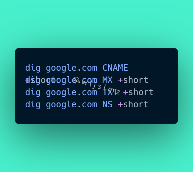 例如,如果要获取A record特定域名的 ,可以使用 dig 命令,+short将提供不冗长的信息: