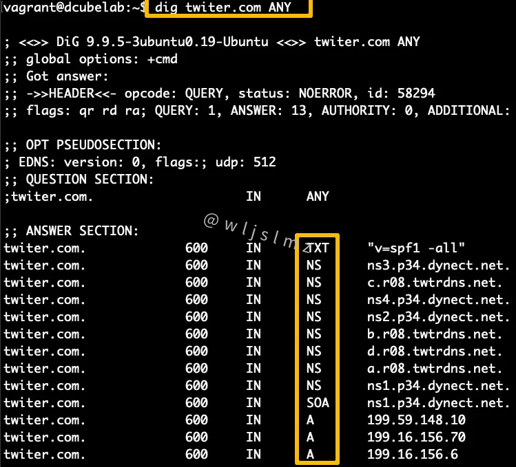 以下命令返回一个 twitter.com 的所有 DNS 记录和 TTL 信息:
