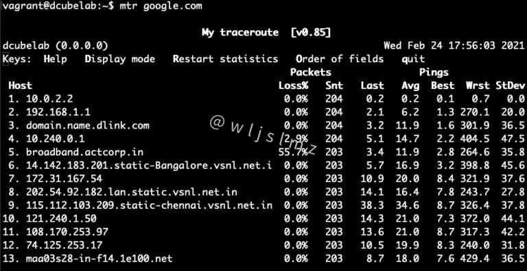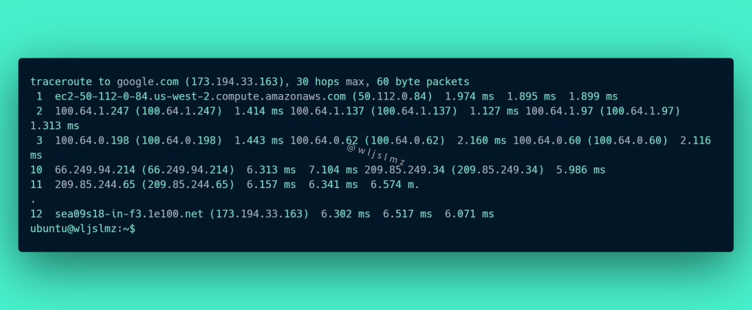 上面的输出显示了从 wljslmz AWS ec2 服务器到达 google.com 的跳数 (12)。