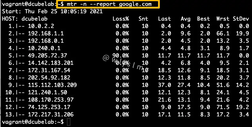 您可以使用 –report 标志生成报告。当您运行 mtr 报告时,它会向目的地发送 10 个数据包并创建报告: