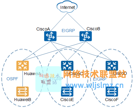 该举例中以HuaweiA和CiscoA为例展示OSPF对接EIGRP的相关配置。