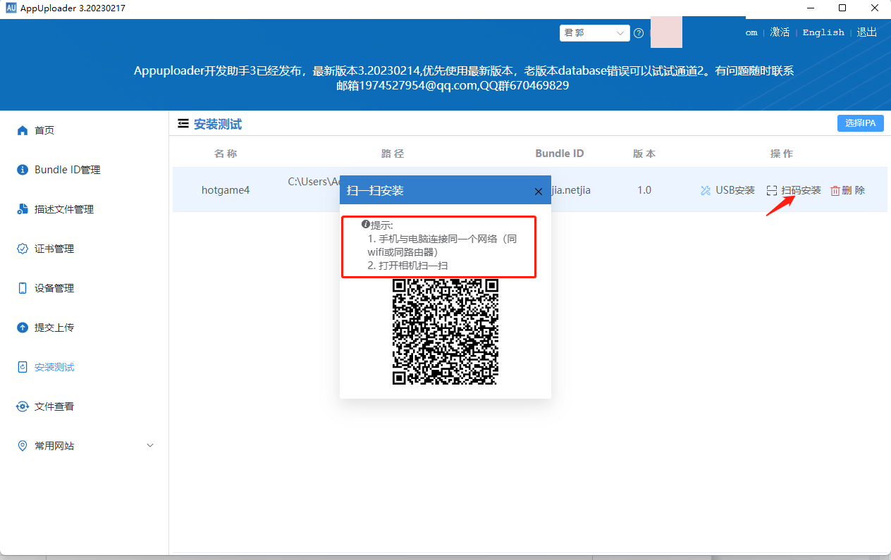 1.扫码安装 上传成功后,点击安装手机扫码就能测试啦!具体步骤按照上面提示内容操作即可。