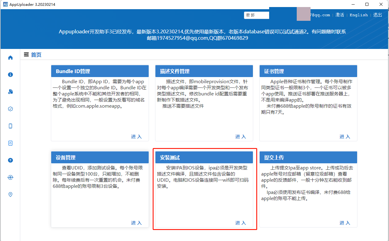 进入“安装测试”页面,选择一个(必须是开发类型描述文件编译,且描述文件包含设备的UDID)的IPA文件上传。