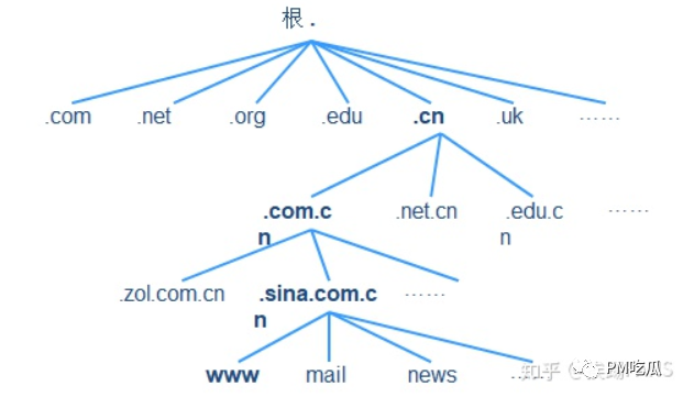 DNS的分布数据库是以域名为索引的,每个域名实际上就是一棵很大的逆向树中路径,这棵逆向树称为域名空间(domain name space),如下图所示树的最大深度不得超过127层,树中每个节点都有一个可以长达63个字符的文本标号