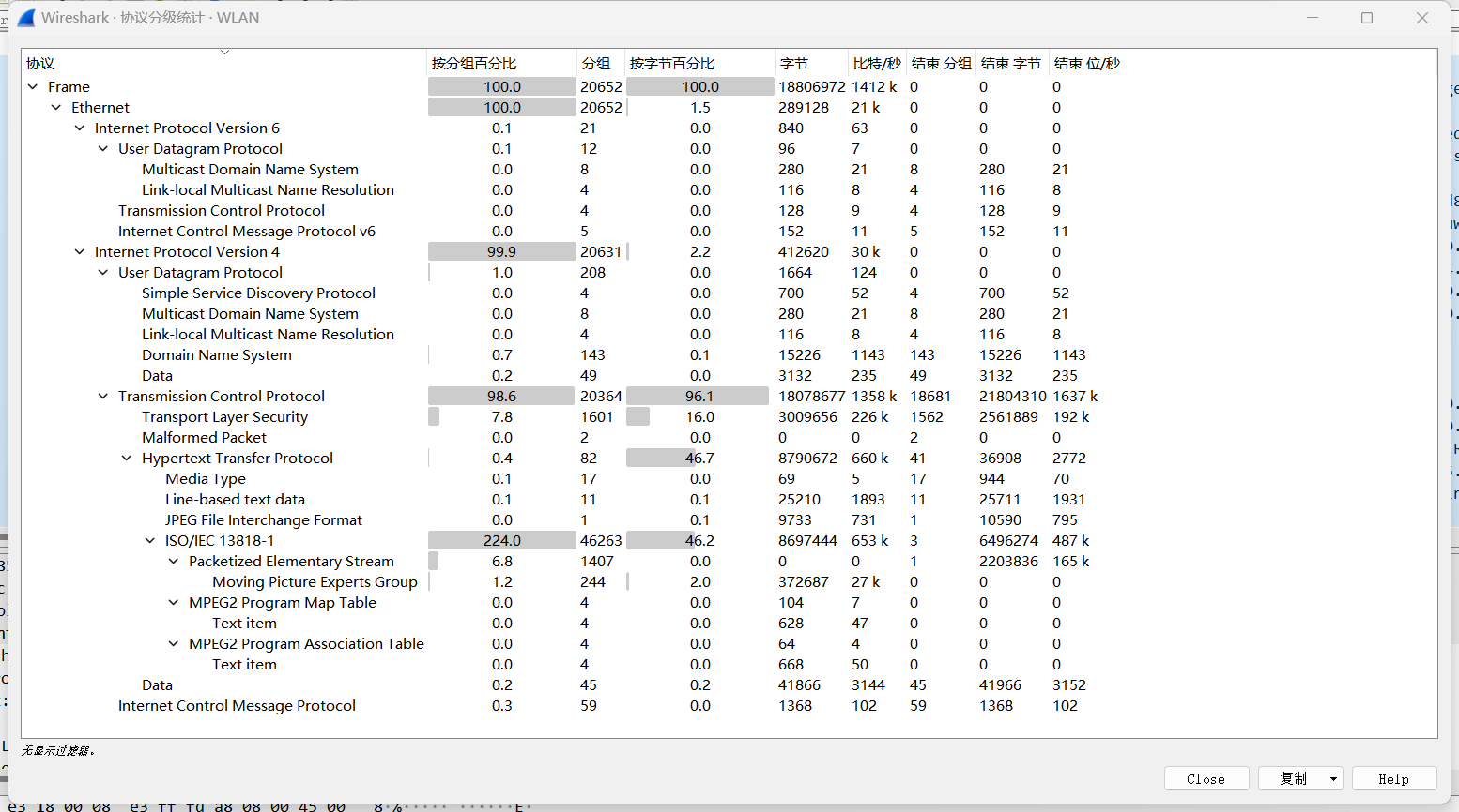 首先在Wireshark的统计菜单中查看协议分级统计,可以看到在物理层和数据链路层,全部都是以太网数据帧,这毋庸置疑。 而在网络层,按照分组百分比,99.9%的包是基于IPv4的,,只有0.1%的包是基于IPv6的。这说明在抓取期间的只有极少的IPv6通信。 在会话层,主要是基于IP的UDP、TCP、ICMP协议,其中基于IPv4的TCP协议的数据包在分组百分比和字节百分比占上均非常突出,这说明IPv4的TCP包不仅数量多,而且总的数据载荷(以字节数衡量)也多。而我们在抓取期间主要进行的活动(点播短视频),自然地认为应当有大量视频数据传入本机。结合统计数据,我们初步分析认为,视频数据通过大量的TCP包从网络传输到本机,这也意味着一个完整的视频被拆分开来进行传输。 在基于IPv的TCP协议下,可以看到分组百分比和字节数百分比占比较大的是HTTP协议,其次是TLS协议。而在HTTP协议下,值得令人注意的是,我们看到了ISO/IEC 13818-1标准,该标准是一种描述多个视频,音频和数据基本码流合成传输码流和节目码流的方式,隶属于MPEG-2标准。结合数据占比,几乎可以说明本次腾讯视频的短视频点播,就是在ISO/IEC 13818-1标准的基础上对音视频进行编码传输的。