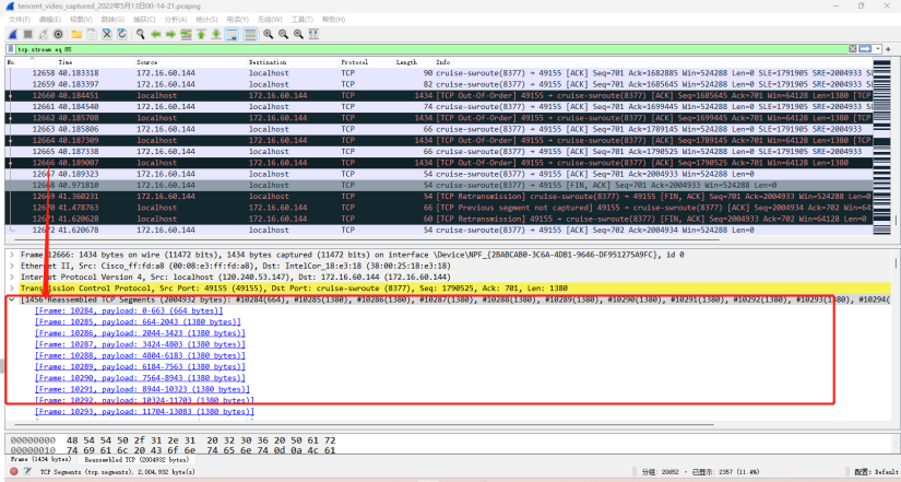 传送视频数据 在本机发送完请求后,目标主机收到请求,返回一个Ack=1(红色框)表示收到接着就开始用TCP分段传输(蓝色框及下面的内容)的方式返回HTTP Response。其中服务器发给本机的第一个分段TCP数据包的TCP头部中,ACK和PUSH标志位同时为1,表示该帧为开始。后面的分段TCP帧头部则只有ACK标志位为1。