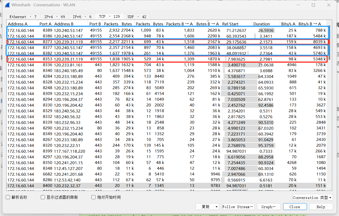 接着再在TCP层面查看会话统计,依旧是按照传入本机的传输字节总大小,从大到小进行排序。再次看到熟悉的主机A(120.240.53.147)和主机B(120.239.31.119)。但我们注意到,两台主机均使用49155端口,但传入本机时,本机使用了多个不同的端口进行接收。