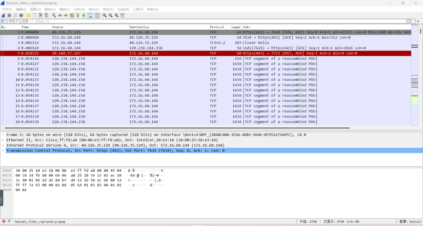 再观察四个包的以太网数据帧,四个包是同一个以太网出口端口,因为四个包的太网(Ethernet)头中的Source的MAC都是一样的(00:08:e3:ff:fd:a8),这是由于本机通过WLAN接入校园网,数据包传进来后Source被修改为了校园网内的一台网络设备的某个端口的MAC,与传来的视频服务器无关。