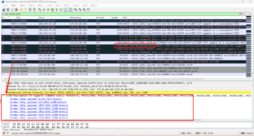对第一个包查看时发现,其TCP载荷是由多个帧的载荷片段组成的数据,共1513个TCP片段的载荷,每个数据载荷所在的帧已经由Wireshark列举出来(红框中蓝色字),点击可以跳转查看对应帧。 这可以说明,序号为10235的第一个TCP包承载的内容较大,所以被拆开来了再进行传送,最后在本机组装成为完整的一个回复。查阅资料可以知道,这种方式叫做TCP数据分段传输。当TCP帧的承载数据大小超过了MSS(Max Segment Size),为了防止IP帧分片(超过MTU),就得将承载数据拆分并封装到多个TCP帧中进行传输。