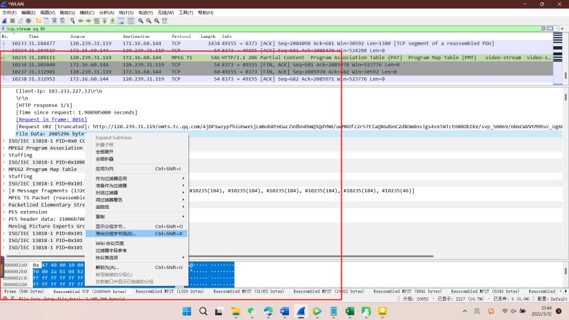根据上小节的TCP传输分析,我们得知了TCP数据分段传输的方式。下面我们尝试追踪这一过程。右键第一个MPEG包,选择追踪TCP流。