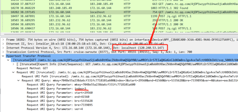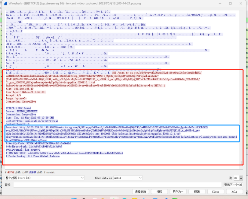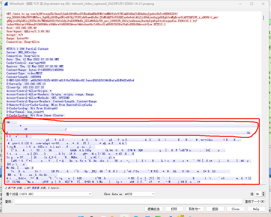 建立完连接,本机马上向目标发送HTTP GET请求,请求视频数据。完整请求URI如下: http://omts.tc.qq.com/AjDP1wzypfhiUnwxSjLmBob8tHOacZVdbn4hmQ5QdYN0/uwMROfz2r57EIaQXGdGnC2dXOm8nsJgs4vxTmTctHXBObIkV/svp_50069/6NxCWVVtM9bvc_Ug6HLj69fBgxKW1s087Qj7P3PCyhObem4BoRu-JXsMiQQTUoTGlRKCuo6w9ebi40j2jdf44jwx0qjp6kEgh7xuMgErcr0iAFITQFlUP_s_sBO9k-i_pm-qKKpjrxk5pbBCyjJ0fYmiHo7MDAhk6U21VxCxL8pi8akkOWHmKw_SZIaW6Ksh/02_gzc_1000035_0b2ejuabmaaaj4ao4y2ga5qzktodczgqafsa.f306110.1.ts?index=2&start=19480&end=29560&brs=3250332&bre=5335627&ver=4&token=0fc0efc341001f990a33d37ca0ecc04f&cost=low&cip=183.233.227.33&mkey=global_cache&stdfrom=2000&cpro=CN-GD&cisp=cmcc URI中可以看到路径被加密了,但文件名和请求参数依旧是明文。文件名通过后缀可以知道是一个ts视频文件;参数主要为请求视频的参数和请求的合法性校验等。详细解析放在下一节解析进行,本小节主要描述TCP流。