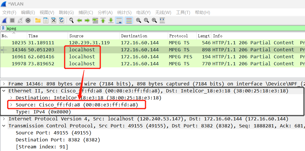 根据协议分级统计,我们知道了视频的传输与HTTP协议和MEPG-2标准相关。下面输入条件mpeg进行筛选,得到四个承载MEPG协议的包。后三个Source咋一看主机名竟然是localhost!这可能是Wireshark的解析bug,因为数据包里没有写主机名是localhost。