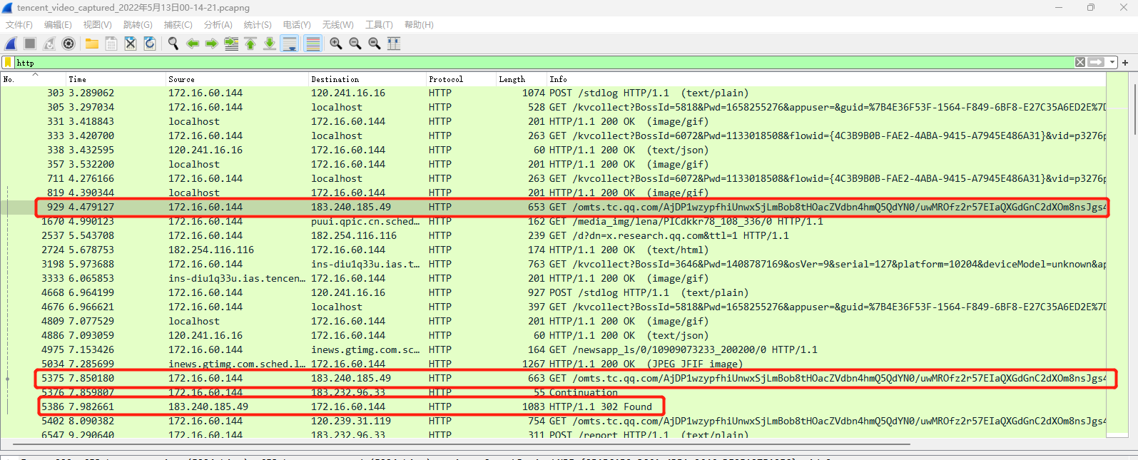 将数据区字节流导出后作为视频播放,发现少了3段缓冲,总共应当有至少7段缓冲视频,而通过mpeg筛选出的只有4段。所以下面转而筛选http协议。
