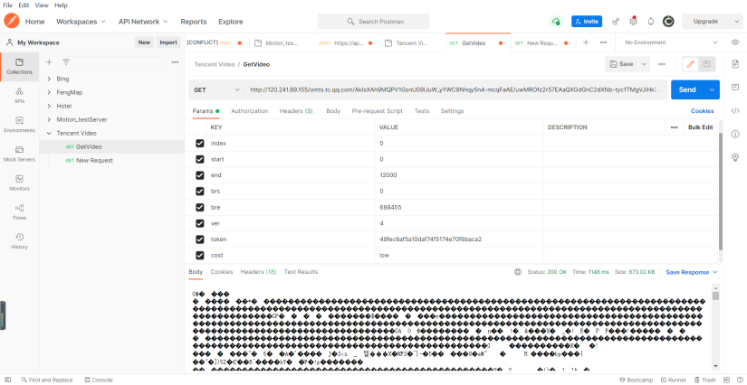 为了检验该GET请求是否可以脱离腾讯视频客户端成功请求和得到返回视频,下面用Postman软件来进行测试。将上面点播视频的请求地址放到Postman里,其自动解析出GET请求参数,点击send后,返回200 OK,返回的Body显示是乱码,但其实是视频的字节流,点击Save Response后可以正常播放。