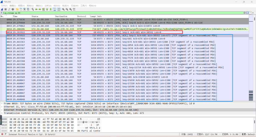如下图,Wireshark自动帮我们筛选出该包所在的TCP流,此时显示的是【查资料看看TCP流是什么】。