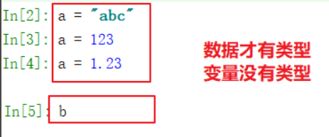 三、查看数据类型 在python中,只要定义了一个变量,而且它有数据,那么它的类型就已经确定了,不需要咱们开发者主动的去说明它的类型,系统会自动辨别。也就是说在使用的时候 “变量没有类型,数据才有类型”。 比如下面的示例里,我们没法预测变量 b 的类型,但是 a 的类型可以根据数据来确认。
