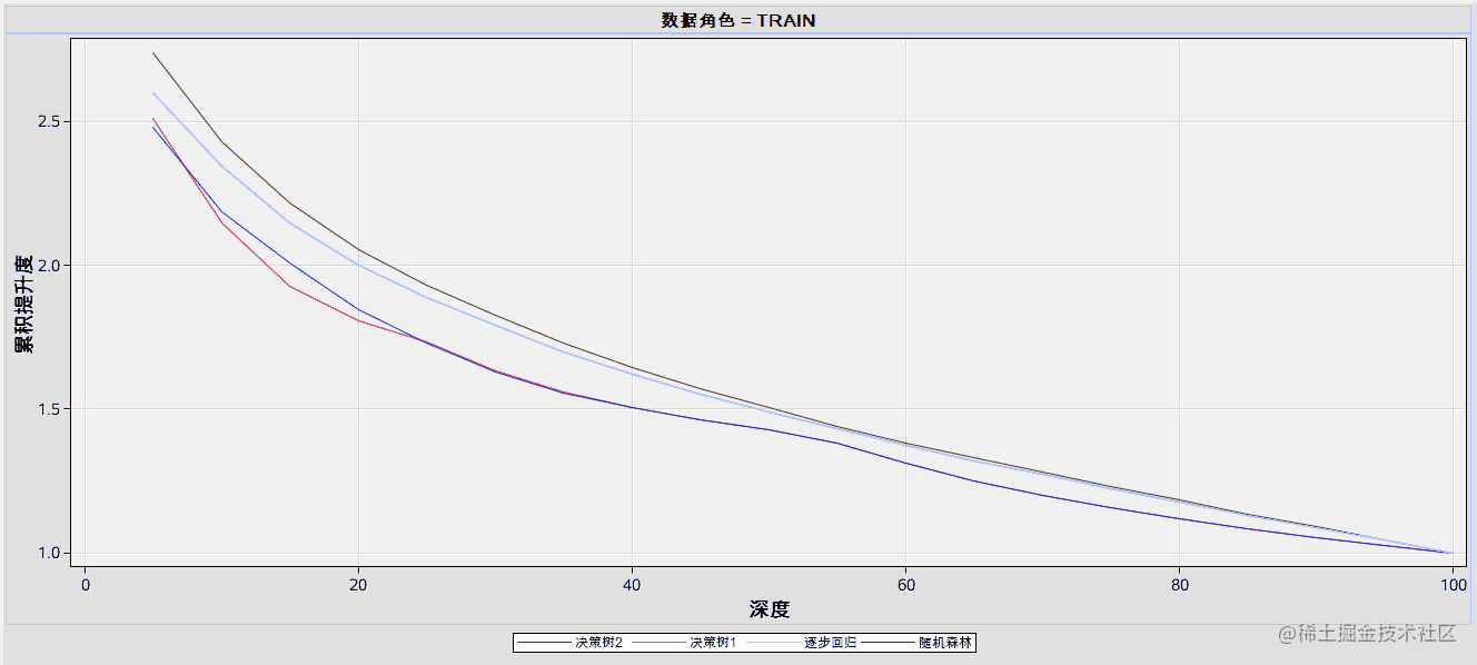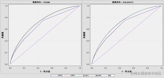 在累积提升度和ROC曲线上,Logistic回归和随机森林表现相近,二分支决策树和三分支决策树表现相近,但是Logistic回归和随机森林模型表现明显优于两个决策树模型。