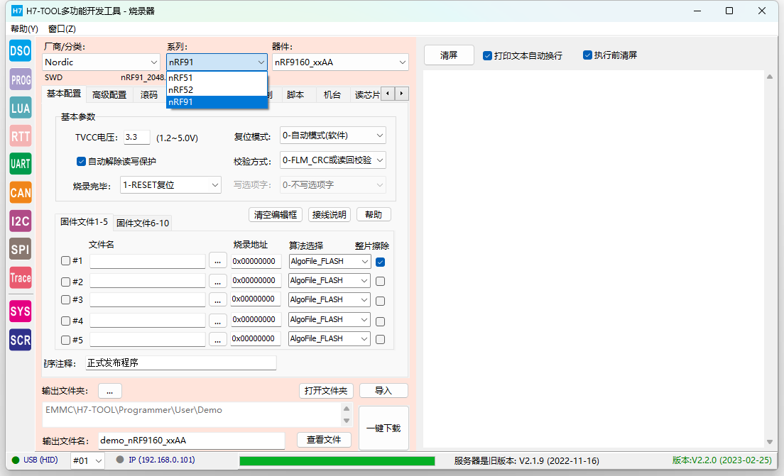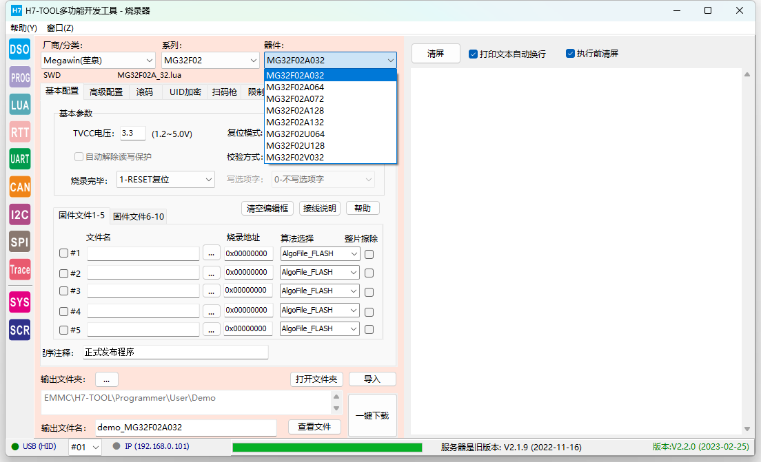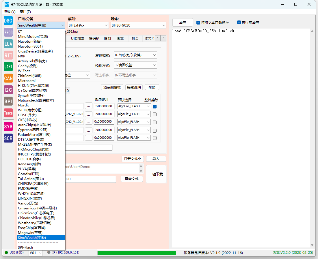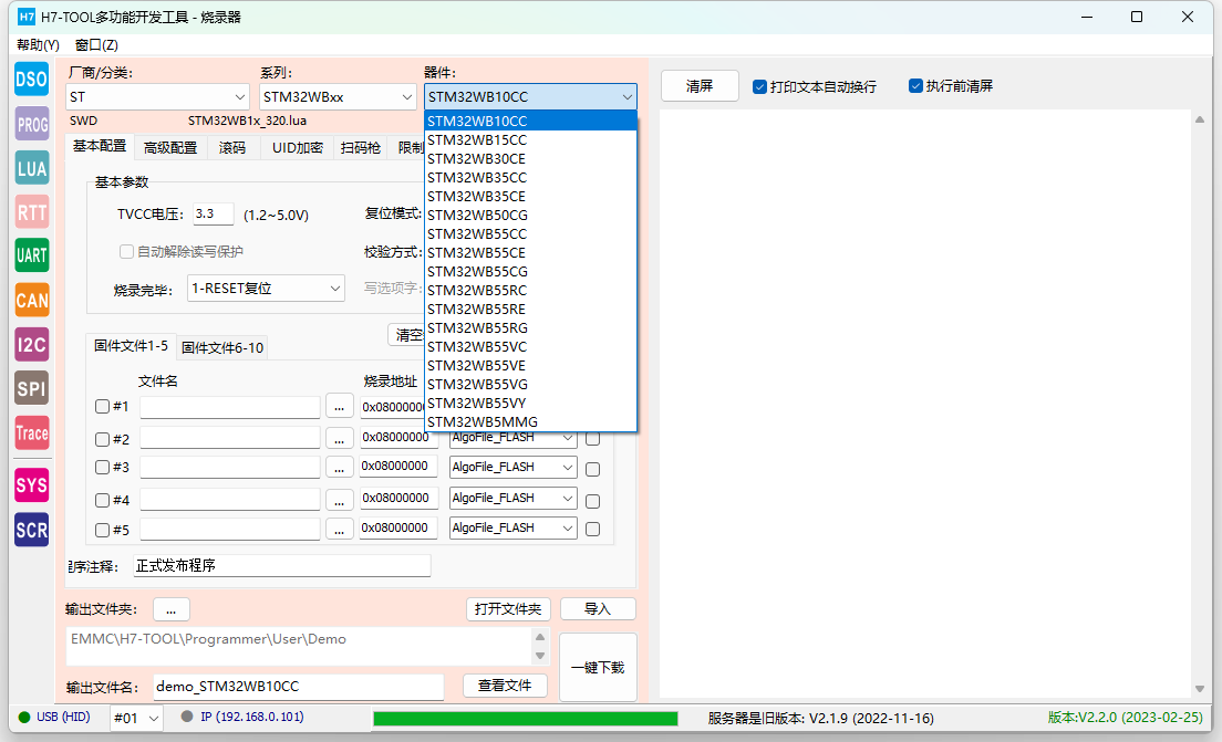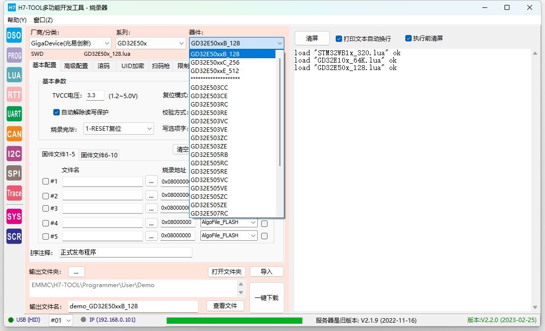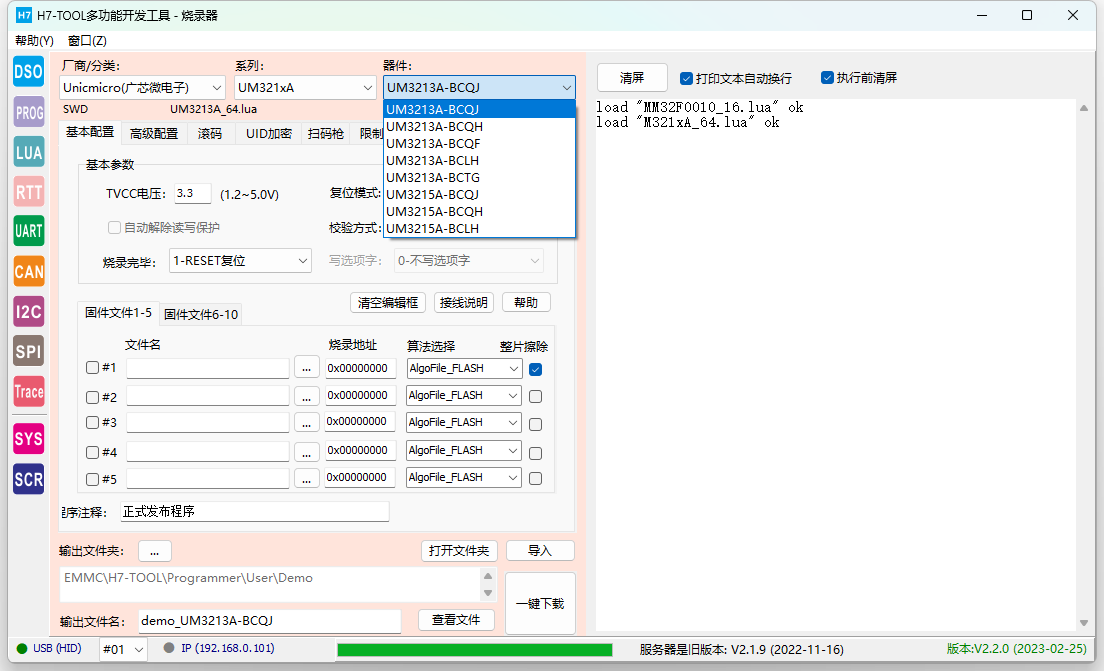 【PC软件】V2.2.0 1.新增Trace功能 -- 新增左侧图标Trace -- 支持在线检测RTX5、UCOS-III、ThreadX任务情况,后续增加FreeRTOS(快完成)、uCOS-II,RTX4,RT-Thread,MbedOS,NuttX和Zephyr -- 支持目标板截屏功能 -- 支持Scope功能(波形显示全局变量值) -- 支持硬件异常分析(Hardfault)V1.0 2.升级脱机烧录功能 -- 脱机烧录界面,厂商列表可设置为常用列表,厂商列表框鼠标右键可设置 -- 脱机烧录界面"文件"页面增加浏览User文件夹按钮 -- 升级机台接口文件,增加单路串行FLASH机台信号 -- 新增芯片型号: - GD32E50x 系列M33核 - 韦斯佰瑞 WB32F10x 系列M3核 - 笙泉 MG32F02、MG32F10x - 中颖,SH30F9871 - Cyress PSOC6 全系列 - AutoChip AC7802x、 AC7840x - 灵动MM32全系列升级更新,删除无用的型号,添加新型号 - ST公司STM32WBxx系列 (STM32WB55) - Nordic NRF9160 - 广芯微UM3213A新增XT25F64算法 -- 解决N32G430烧录问题,修正lua文件中RAM大小 -- GD32F30X系列,修复选项字写入异常(暂时只支持设置读保护,不支持其他选项字) -- 导入lua配置文件时新增的变量无法识别,解决该bug, -- 滚码存储格式,支持大端BCD码和小端BCD码。 -- 升级 prog_lib.lua文件,MCU_RemoveProtect()后增加复位操作,避免部分芯片解除读保护后不能直接读UID -- 取消生成USE_TEST_BIN烧录临时文件的代码快(早期固件,已废弃) -- 新增AlgoFileCorrect[]用于手动修正FLM算法地址和容量 3. 示波器拨盘图标更新,增加10V档位,并修改鼠标点击动作机制。 4. 升级EMMC文件时,排除wifi列表文件 【固件】V2.20 1. 烧录单路串行FLASH时,不初始化第2-4路的IO口, 是为了实现机台信号接口。 2. 烧录51、STM8、SPI FLASH时,也支持LCD屏显示滚码。以前版本只有ARM才显示滚码。 3. 新增 DISP_ELF_INFO = 1 表示显示ELF文件信息,缺省关闭显示 4. 针对 PSCOC6 的FLM进行特殊处理. 5. 解决MM32F0020烧录完毕不能复位运行的问题,因为这个芯片的SWCLK和BOOT0复用。 -- pg_reset()硬件复位口线拉低前,强制SWCLK为低电平。 6. pg_swd("JTAG2SWD") 针对多路模式,刷新通道配置。 7. ARM内核新增识别:STAR-MC1 8. 因为NRF9160.整片擦除会清空RAM,因此执行 MCU_EraseMass() 后后必须重载一次算到RAM. -- 新增 ENTER_DEBUG_AFTER_ERASEALL = 1 变量进行控制 9. ELF_ParseFile() 函数新增2个形参,可以后期通过lua改变flm文件的起始地址和容量 10. 修复RTT 无法设置SWD时钟延迟的BUG。新增参数项可脱机调节时钟延迟。