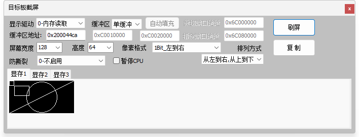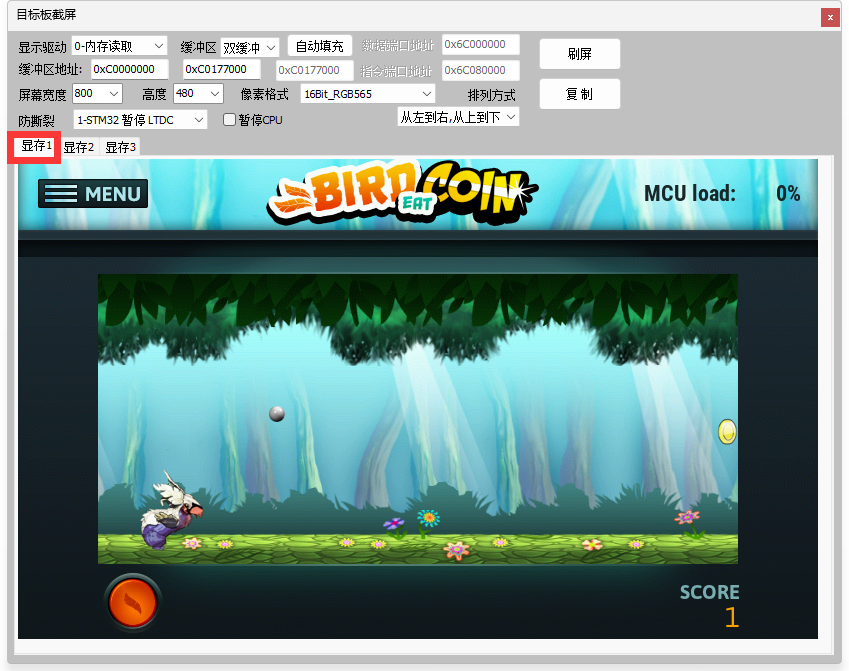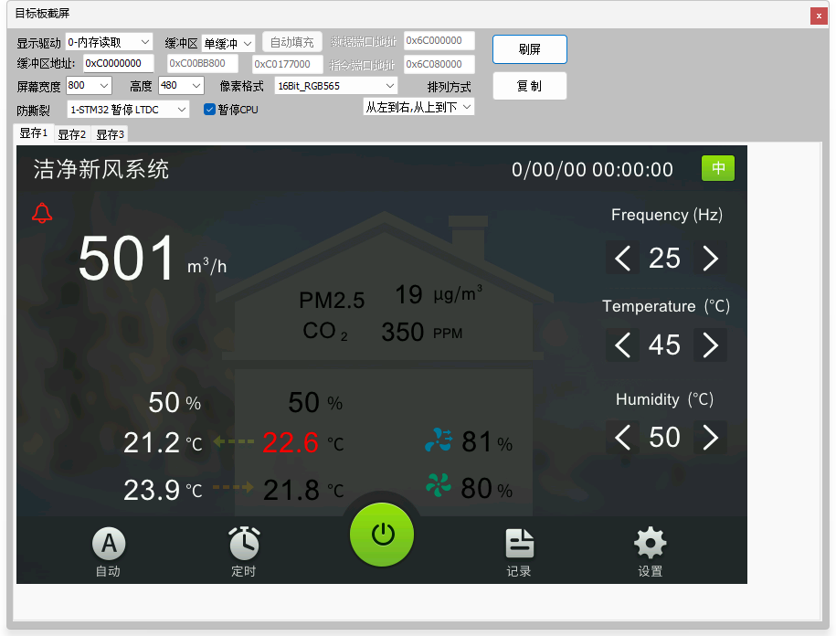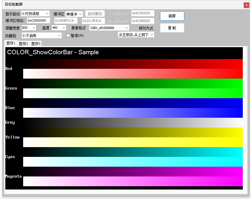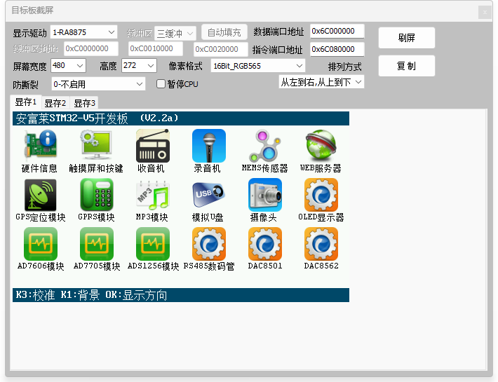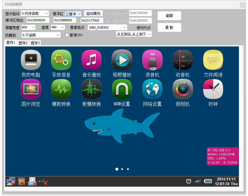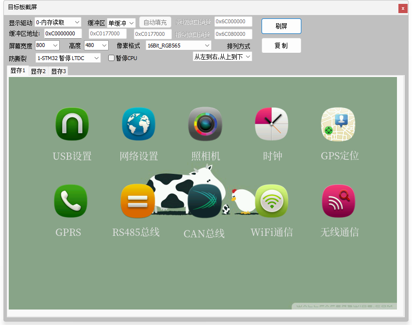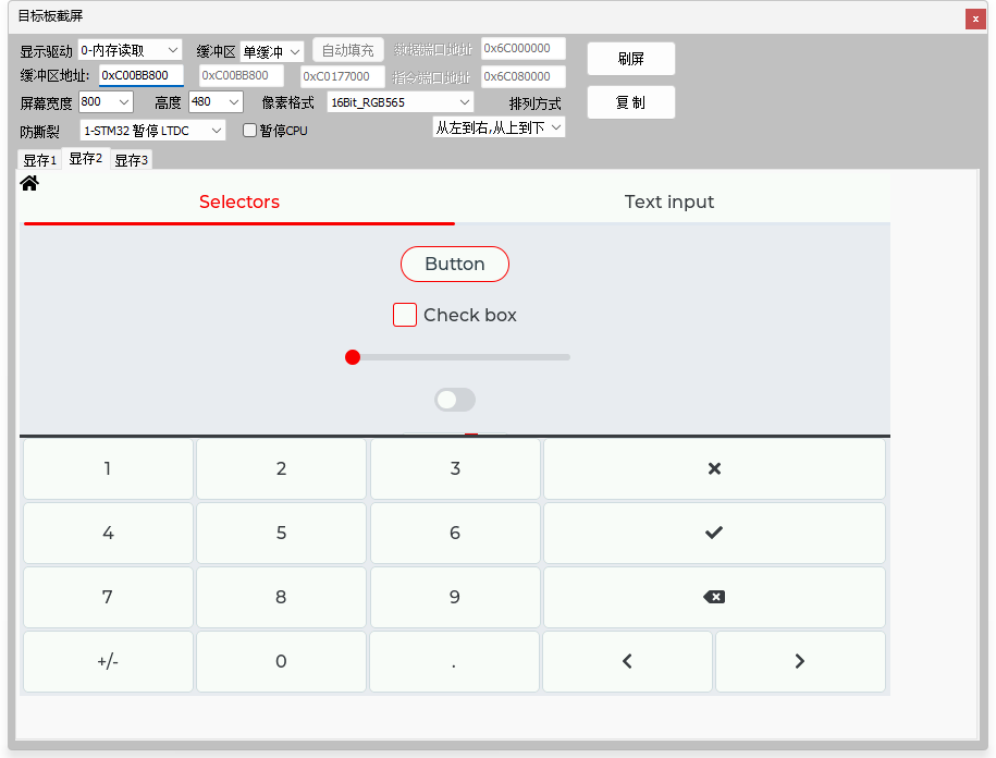 3、截图功能,无需内嵌代码,支持TouchGFX,GUIX,emWin,LVGL,AWTK,裸机等,含多缓冲玩法