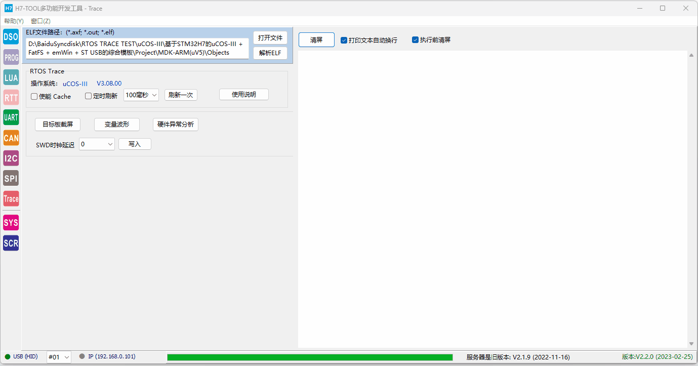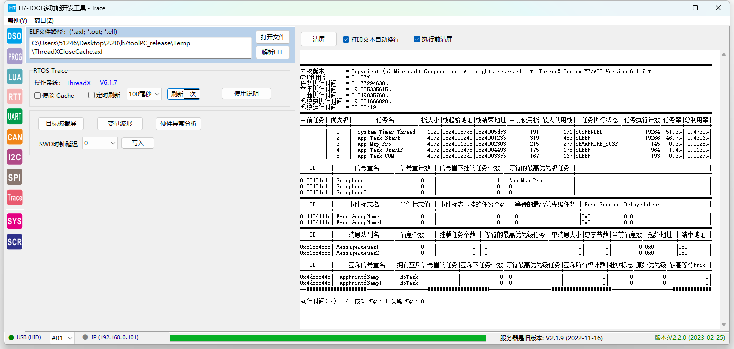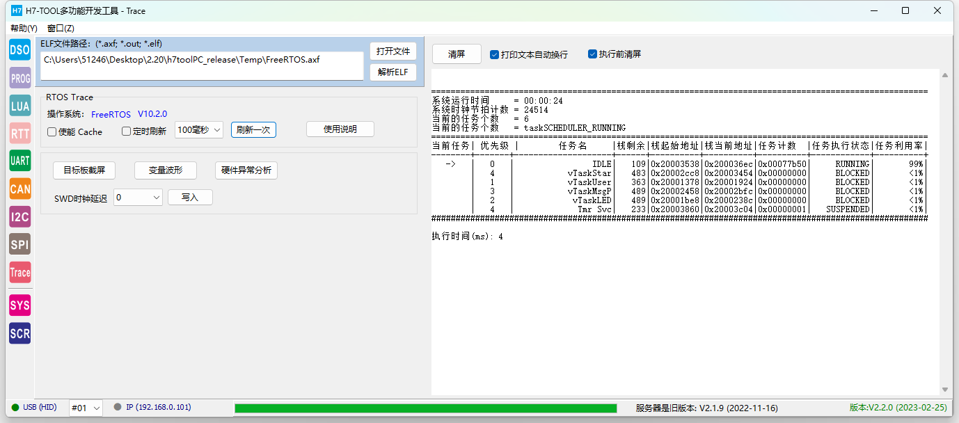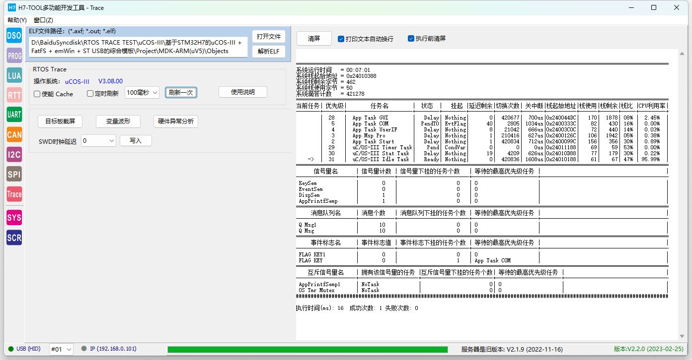 2、RTOS Trace (1)已经支持RTX5,ThreadX和uCOS-III。后续将增加FreeRTOS(快完成了)、uCOS-II,RTX4,RT-Thread,MbedOS,NuttX和Zephyr。 (2)仅需用H7-TOOL的SWD接口连接目标板,可随时随地连接目标板,不复位目标板,不影响目标板的正常功能. (3)不需要目标板额外做添加任何代码。 (4)支持WiFi、以太网和USB连接,支持外网远程访问。USB访问速度最快。