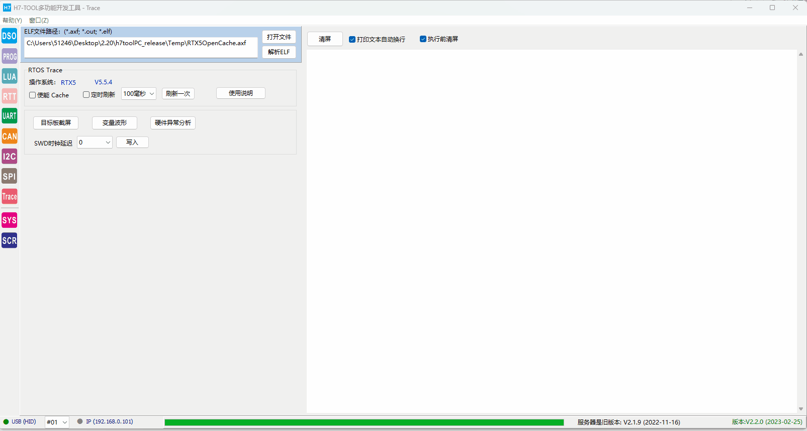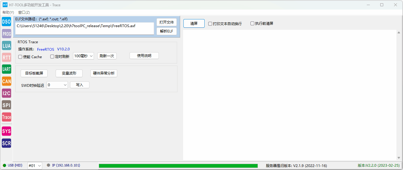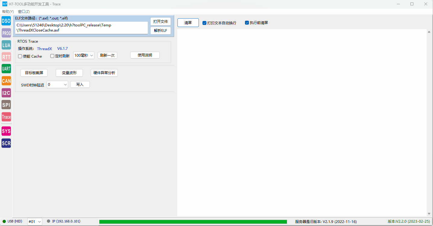 2、RTOS Trace (1)已经支持RTX5,ThreadX和uCOS-III。后续将增加FreeRTOS(快完成了)、uCOS-II,RTX4,RT-Thread,MbedOS,NuttX和Zephyr。 (2)仅需用H7-TOOL的SWD接口连接目标板,可随时随地连接目标板,不复位目标板,不影响目标板的正常功能. (3)不需要目标板额外做添加任何代码。 (4)支持WiFi、以太网和USB连接,支持外网远程访问。USB访问速度最快。