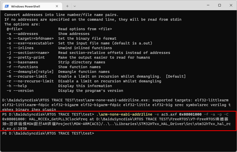 后续增加addr2line小软件支持,通过addr2line小软件,可以方便的锁定位置,比如通过H7-TOOL硬件异常黑盒子功能锁定了出错位置0x0800 1000, 通过下面的命令方便的就锁定了出错源文件的位置