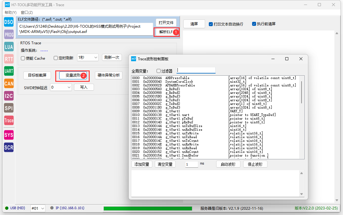 4、JScope HSS波形,支持导入elf,axf,out文件来解析工程的全局变量,含结构体变量成员 1、用户仅需接上SWD接口(3线,4线或者5线均可),无需用户嵌入代码到目标,全程无需复位芯片,直接读取即可,而且随时随地都可以连接目标板,不影响目标板的正常功能,不需要额外资源。 2、JScope的HSS模式是采用的定时器查询方式,如果需要自己控制,大家可以使用TOOL提供的RTT波形打印方式。 3、支持USB,WiFi和以太网通信方式,支持内网和外网访问,其中USB方式速度最快,使用WiFi和以太网方式根据网络情况,调节读取速度.