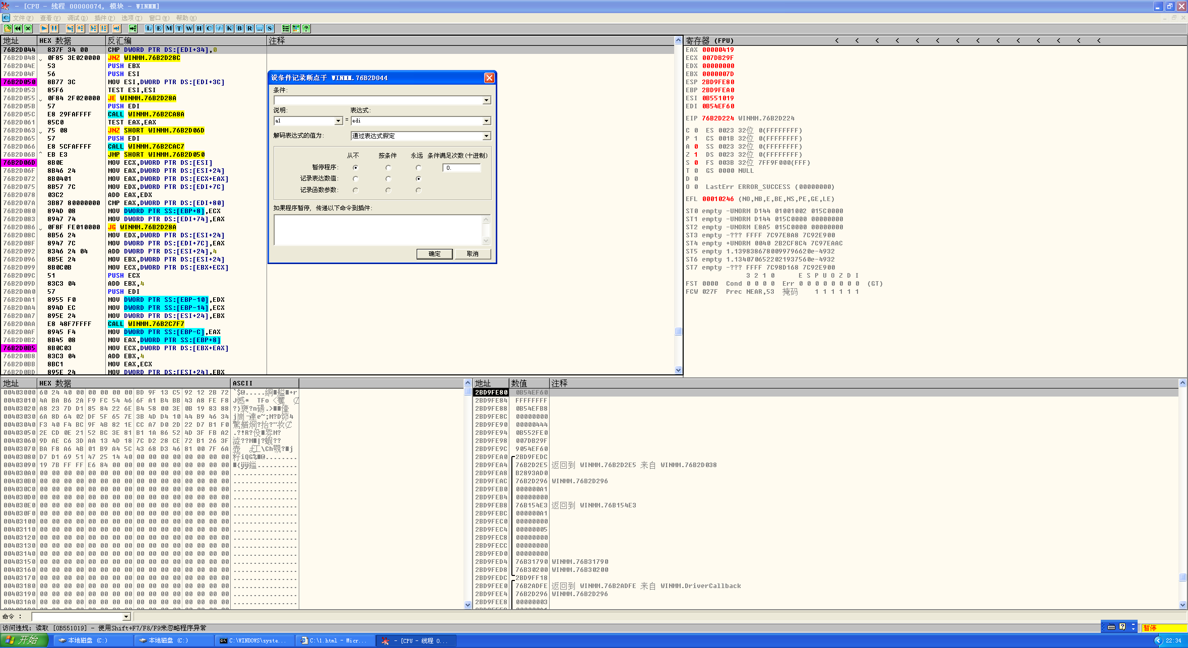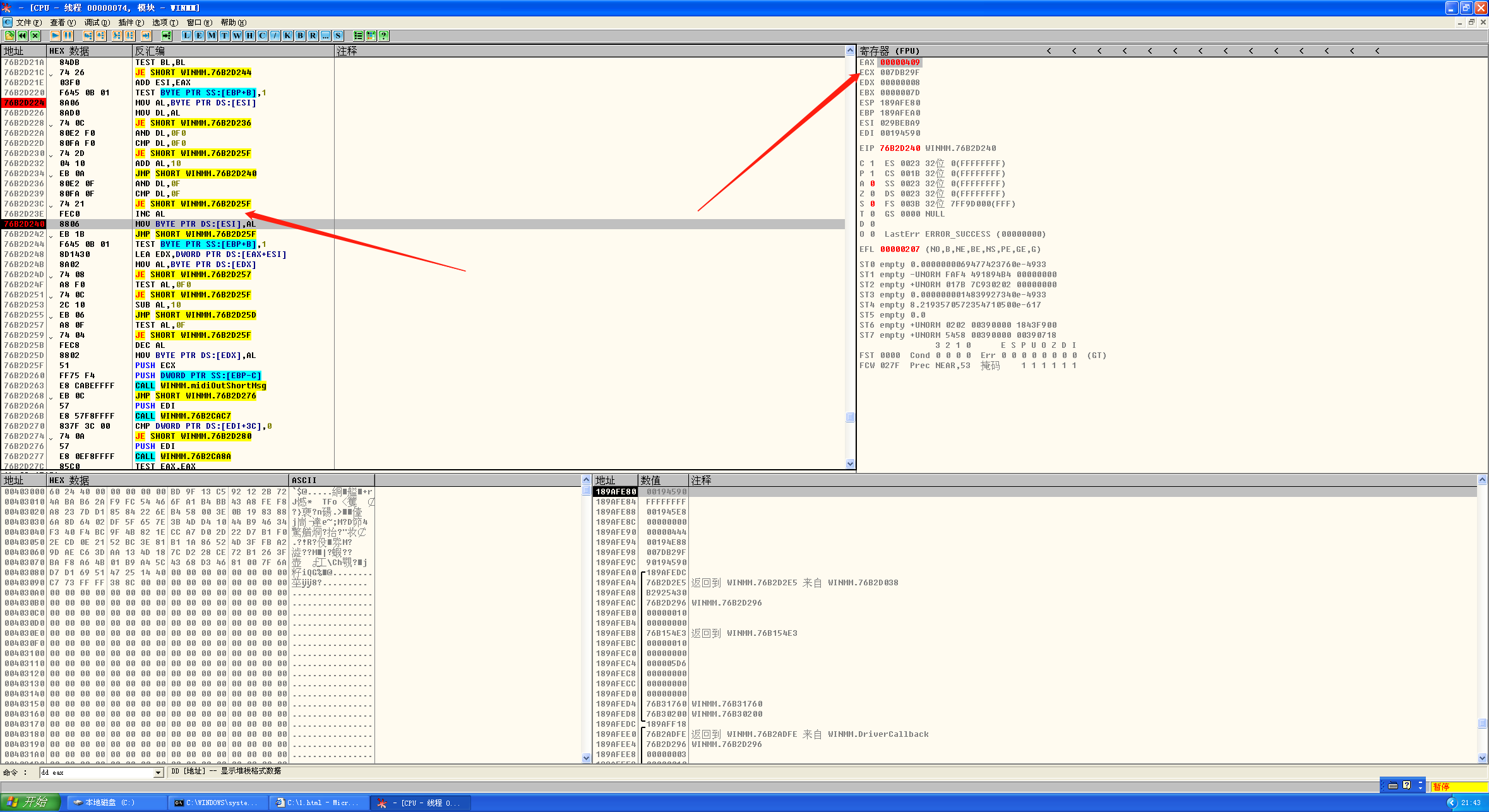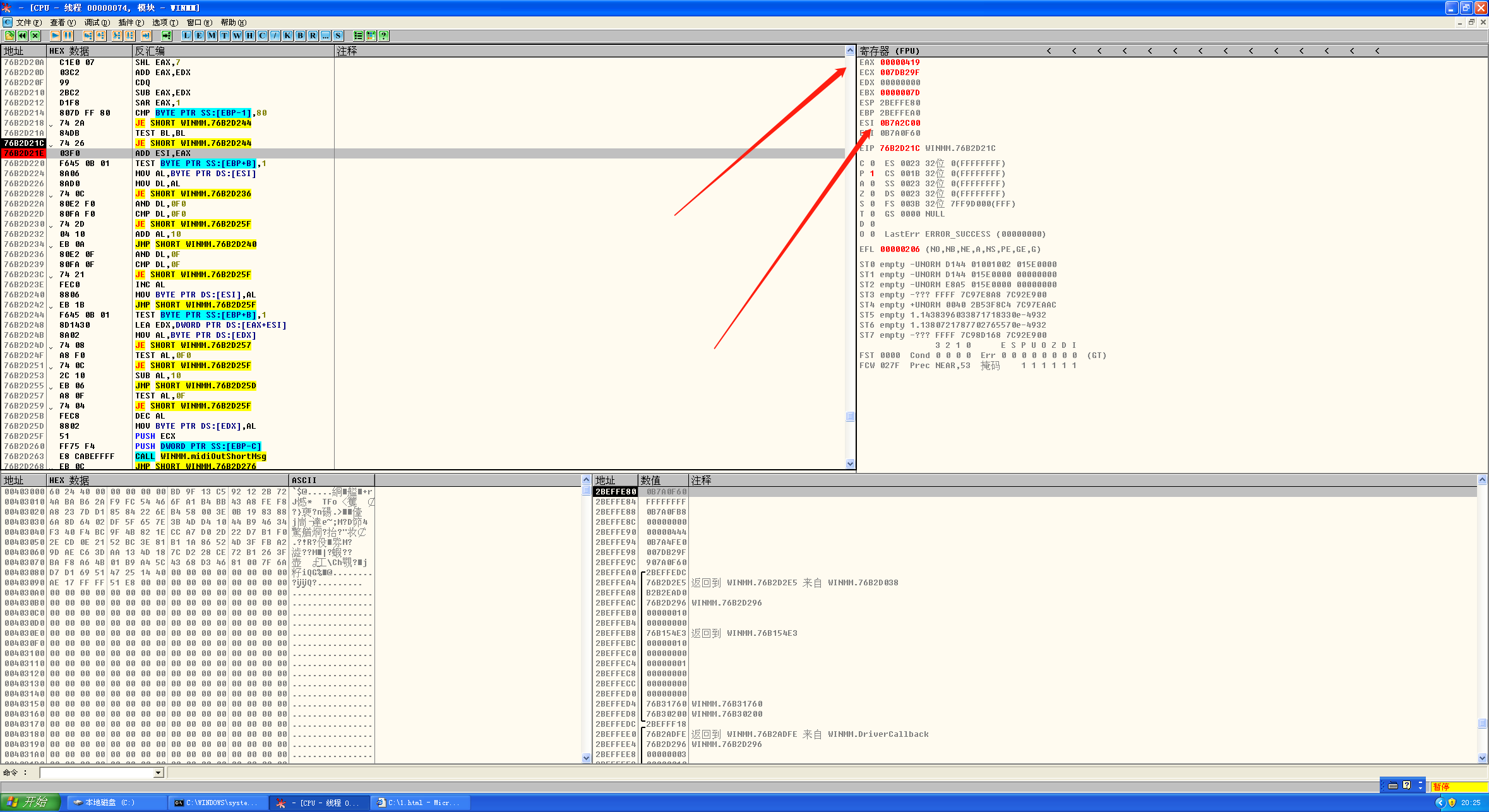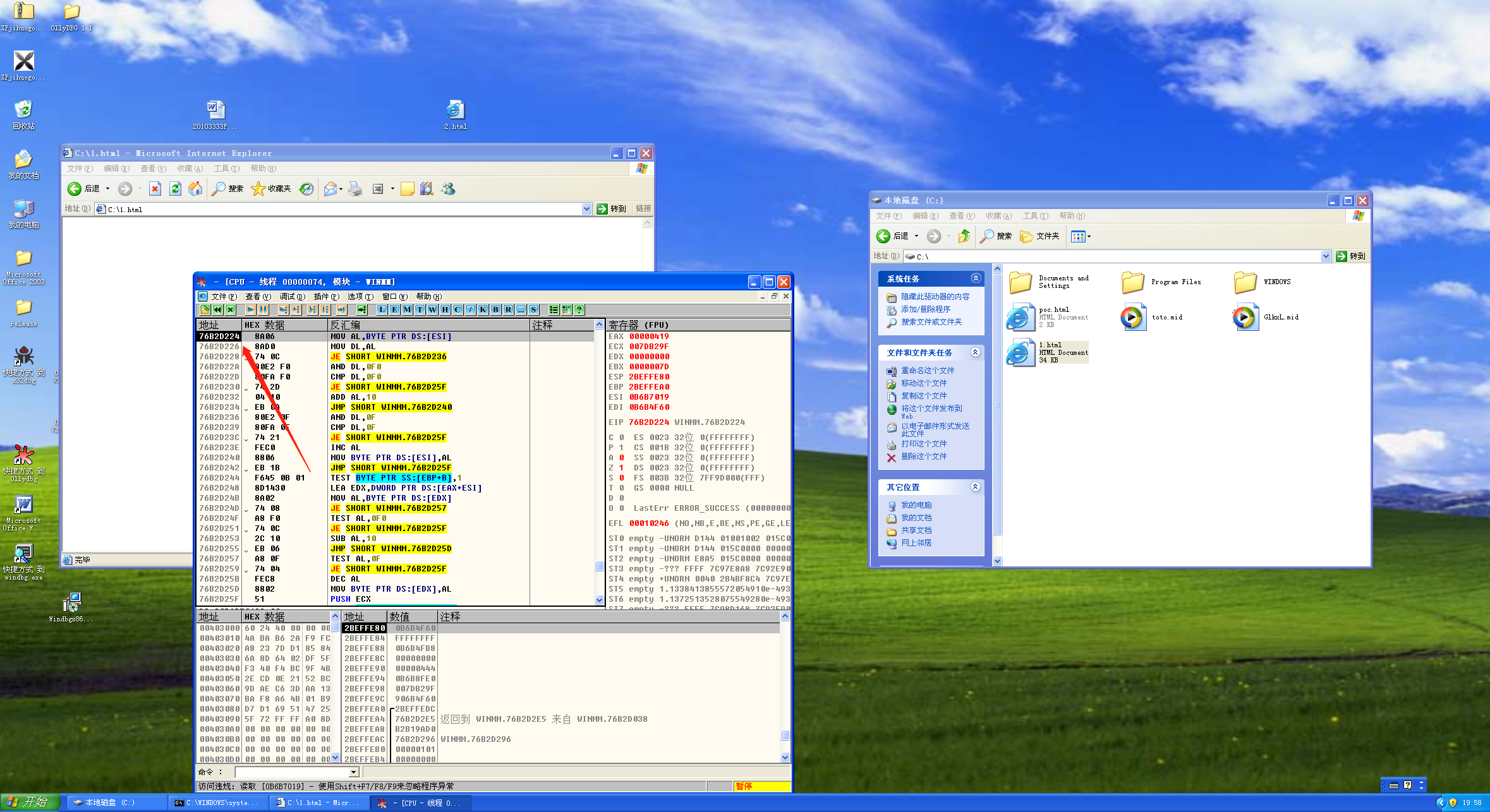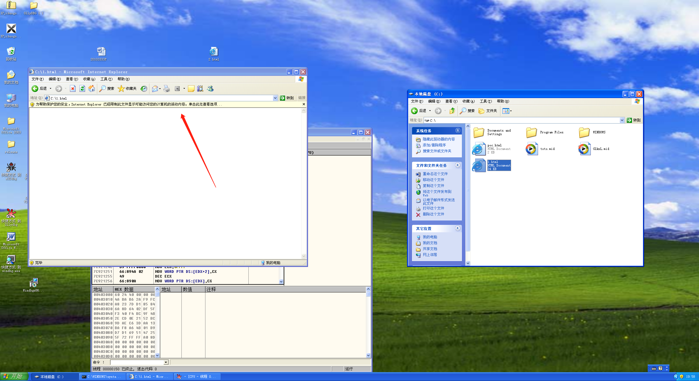 接下来打开IE,再打开OD附加IE,随后拖拽1.html到IE中,在IE上方选择允许运行,断在了溢出位置: