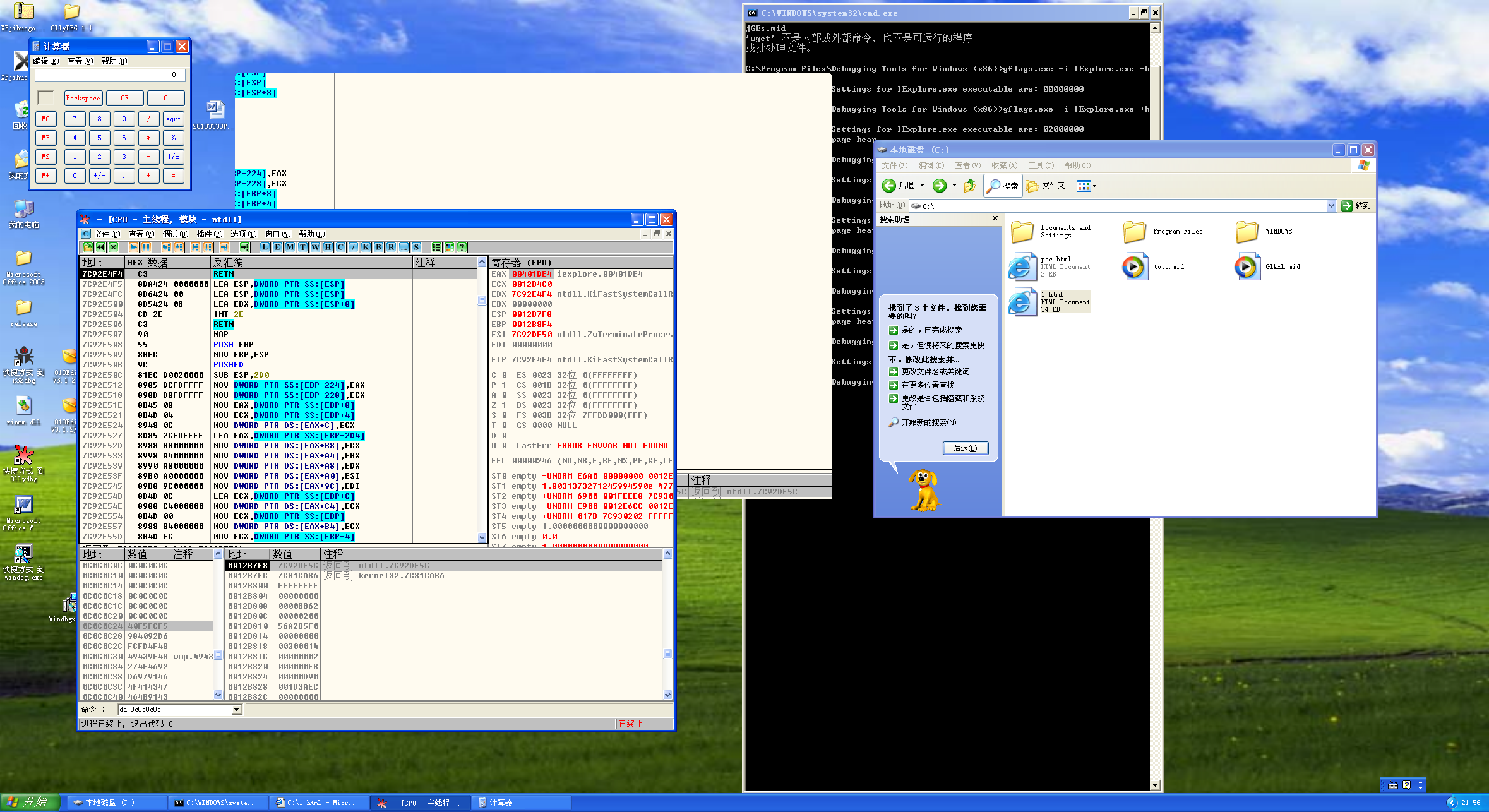 这一块都是0C0C0C0C+shellcode,一直重复的地址。继续走,可以看到计算器被弹出: