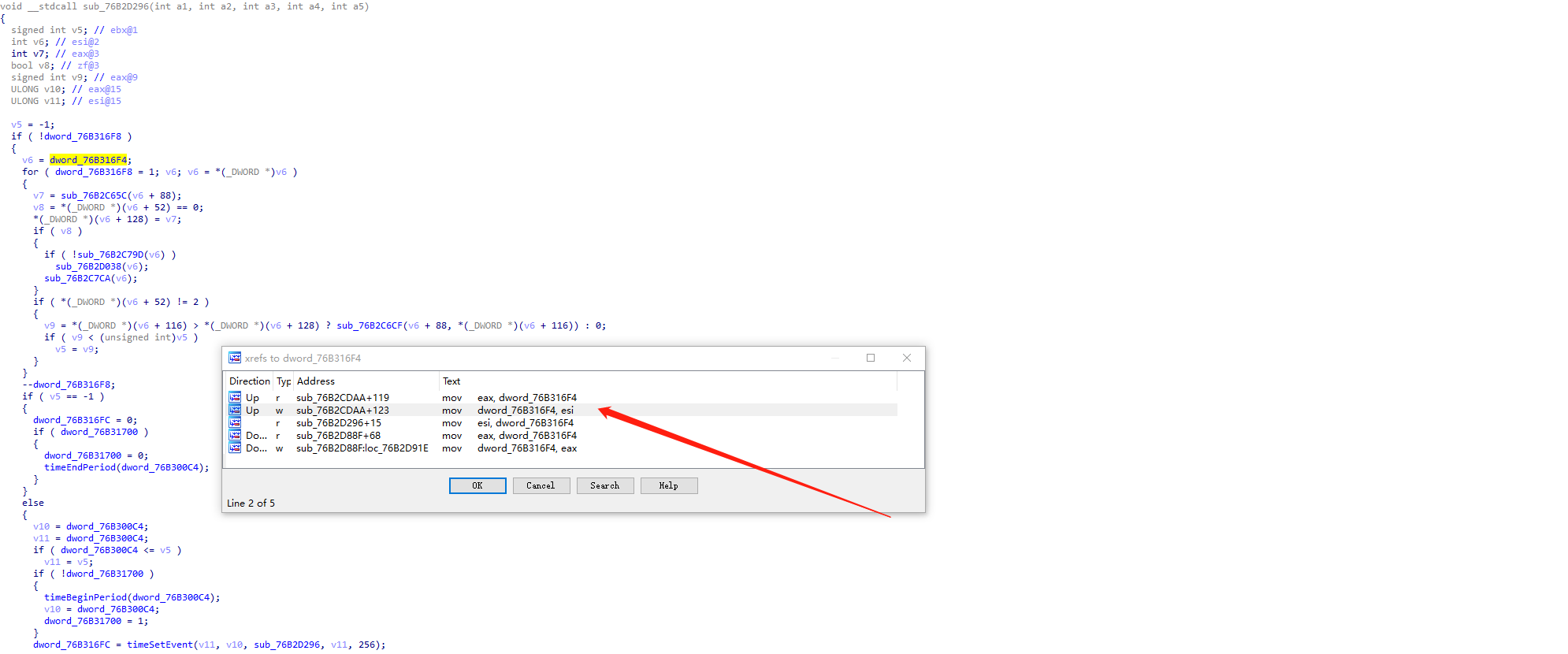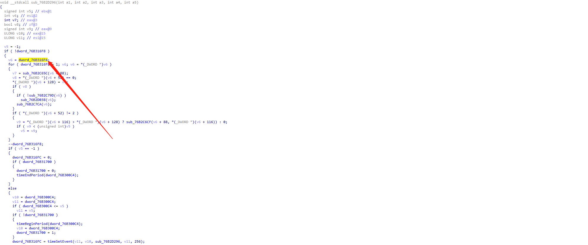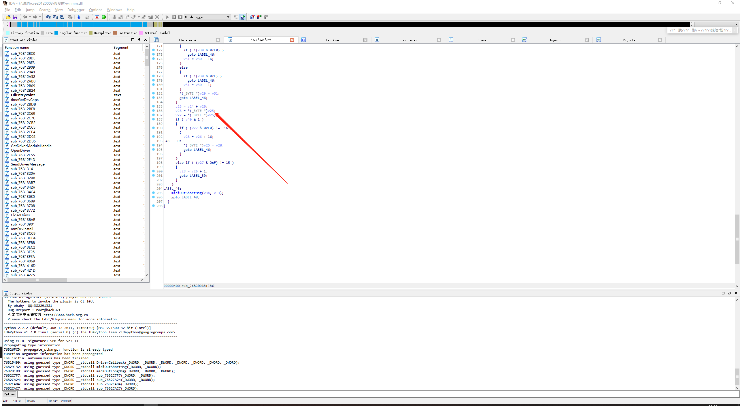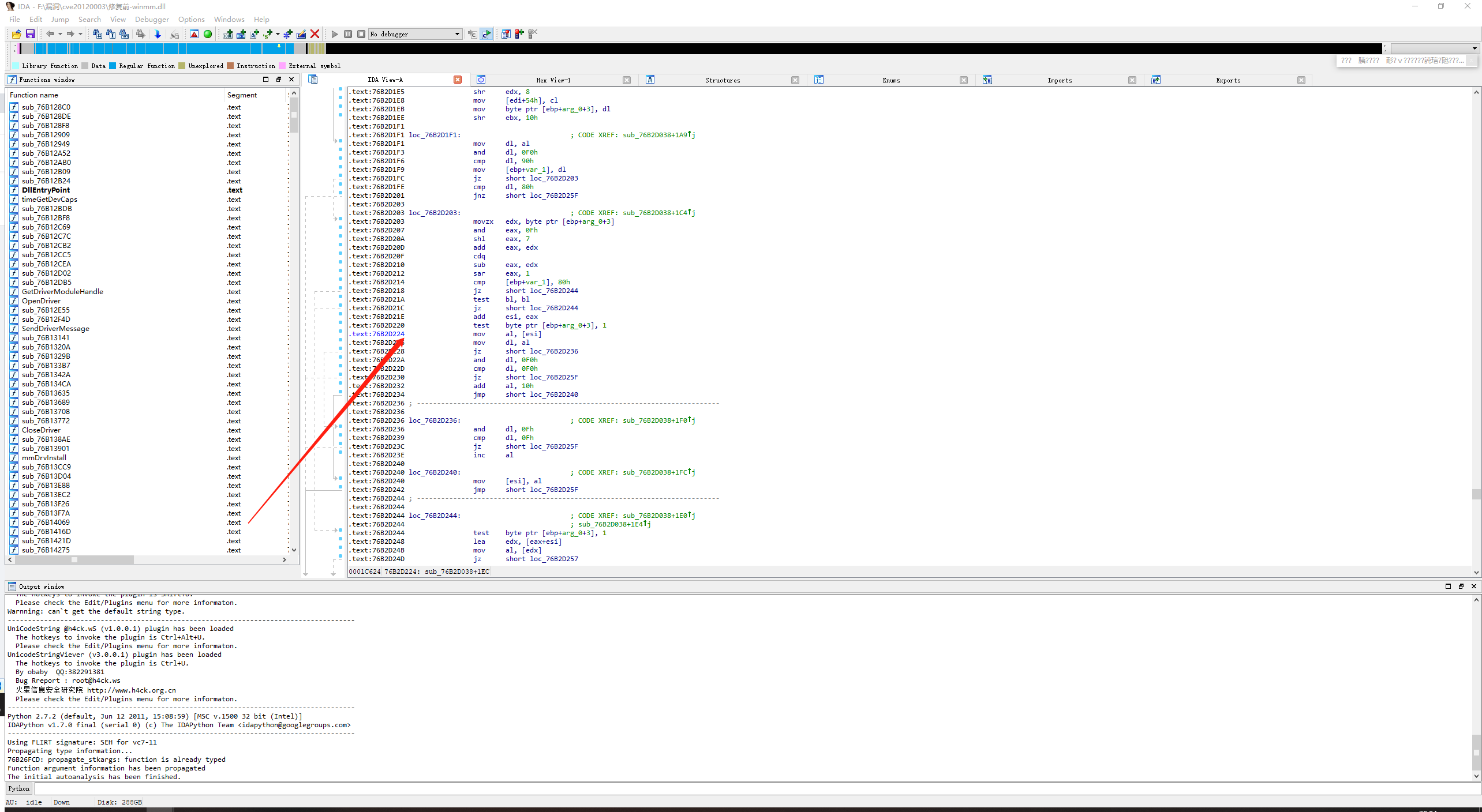 查看各模块基址,可以发现溢出点76B2D224属于winmm.dll,随后找到此动态链接库,拖到IDA中,找到76B2D224,F5反汇编: