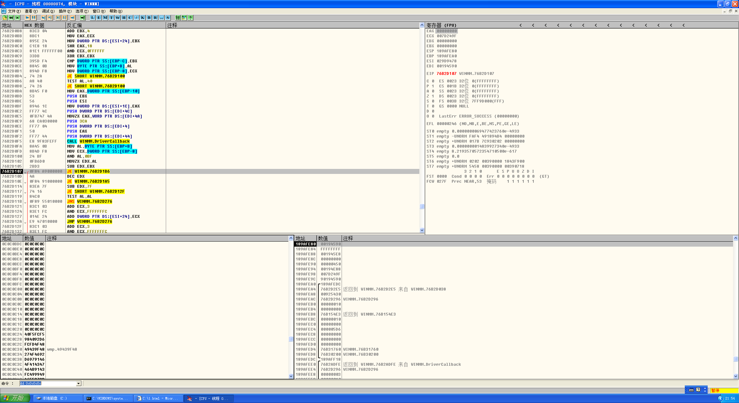 这里是溢出点,在溢出点的时候AL=0x08,是String,而在代码下方箭头地址指向代码Al+1=0x09,后续调用Trigger函数,走到clones[k].w0('come on!'),而这个语句会调用虚表,每一个对象前四个字节都是虚表地址,及0C0C0C0C,从而走到我们构造的堆里面运行shellcode,下面是取消页堆,然后再溢出点下断点,走到下方AL+1的位置: