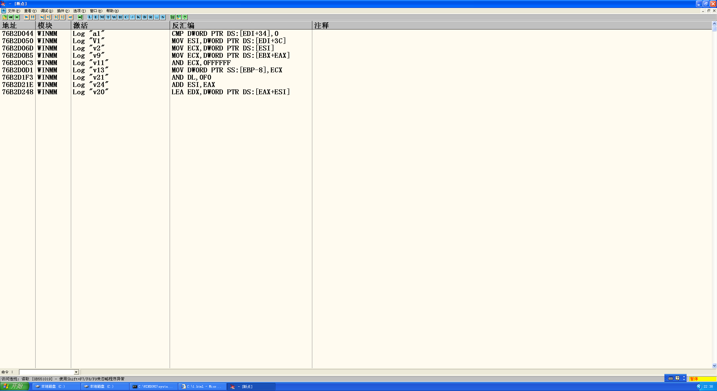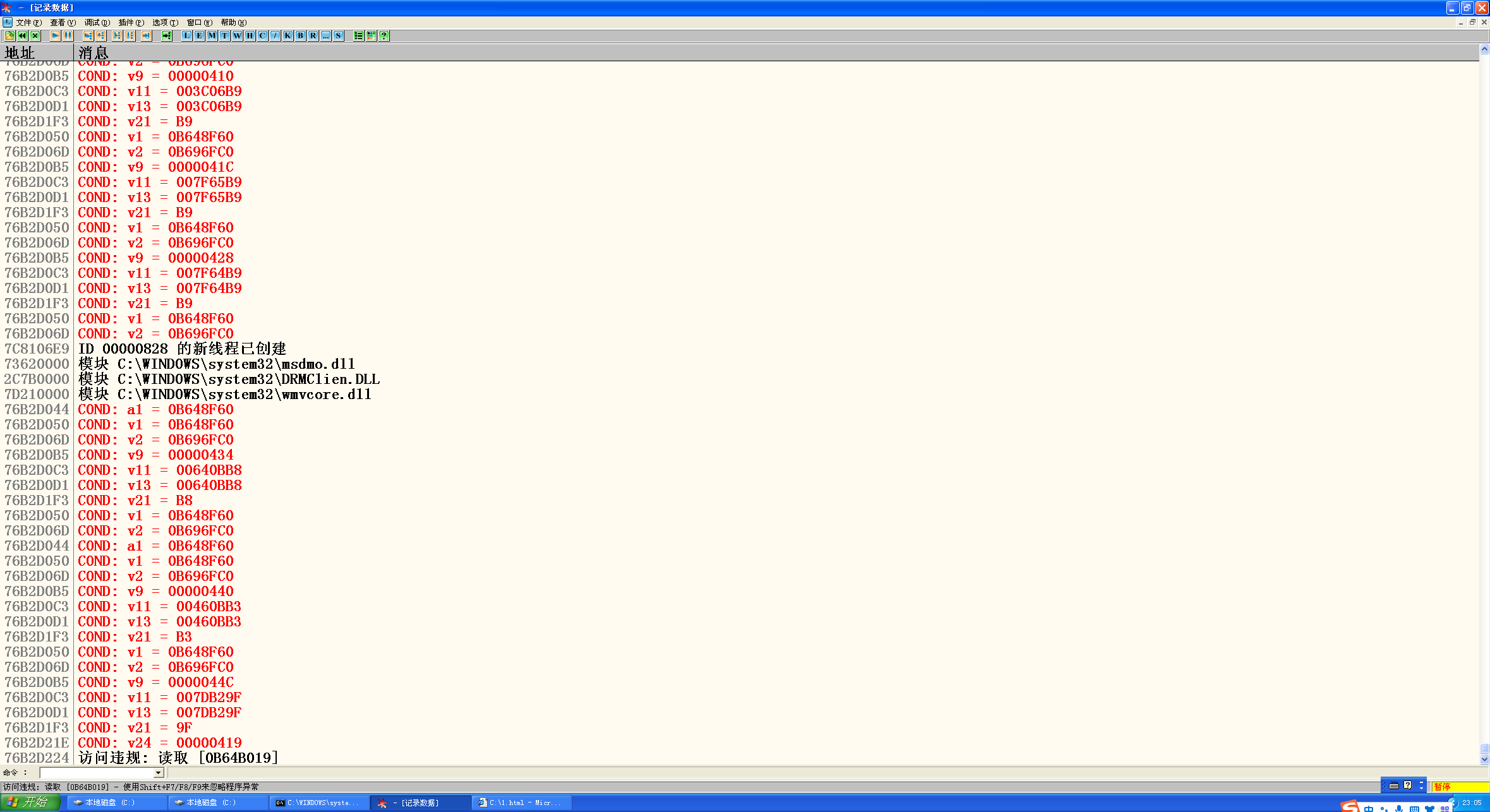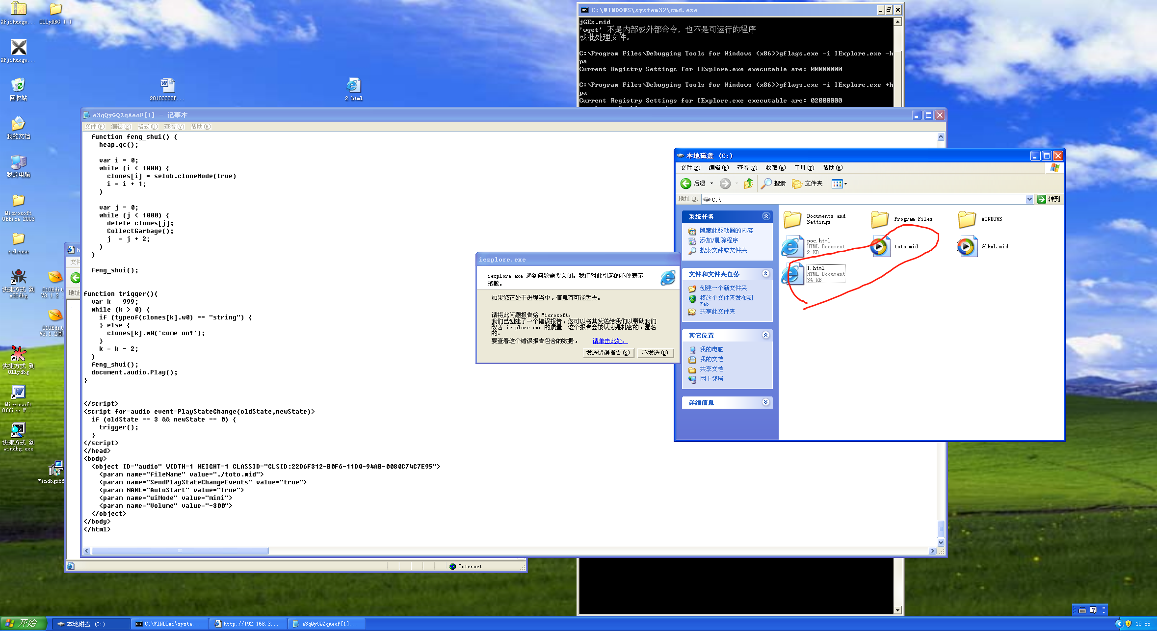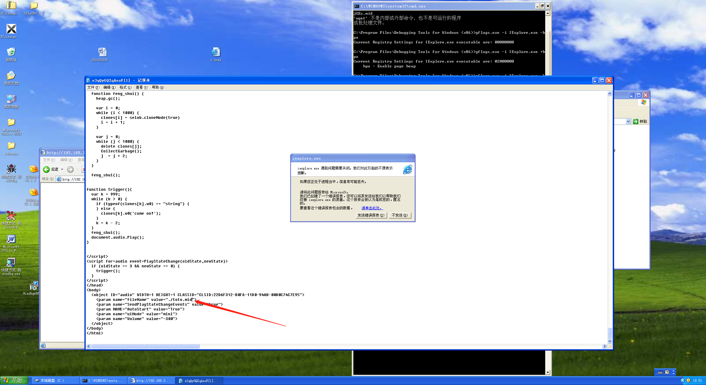 然后用IE继续打开之前拷贝的链接地址,出现错误,右键页面打开源文件,修改mid文件位置为绝对路径,之后另存为html文件,把mid文件放相同目录下(这样可以让winmm.dll解析mid文件触发漏洞):
